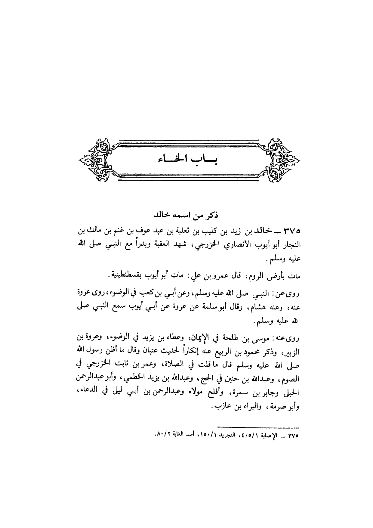 375 - خَالِد بن زيد بن كُلَيْب بن ثَعْلَبَة بن عبد عَوْف بن غنم بن مَالك بن النجار أَبُو أَيُّوب الْأنْصَارِيّ الخزرجي شهد القعبة وبدرا مَعَ النَّبِي صلى الله عَلَيْهِ وَسلم