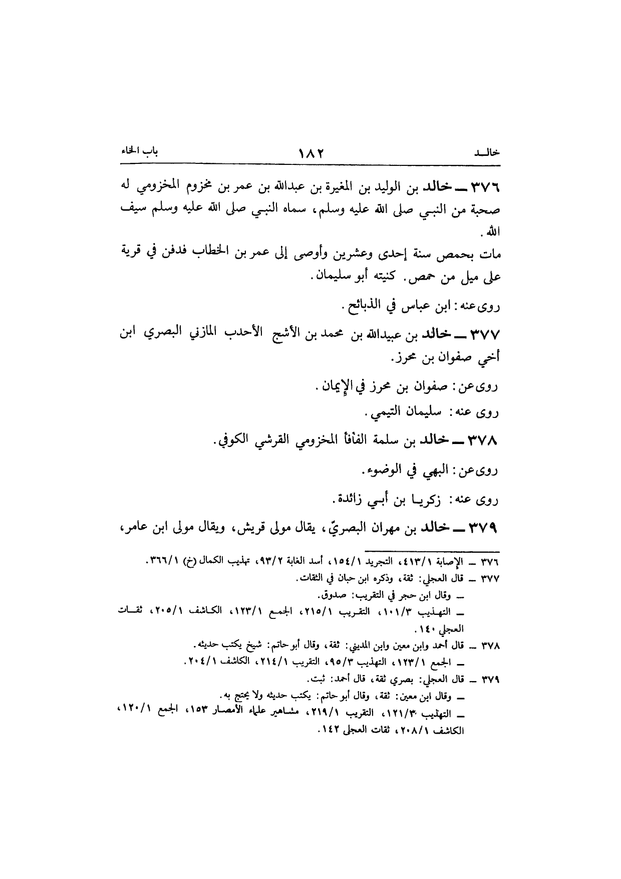 376 - خَالِد بن الْوَلِيد بن الْمُغيرَة بن عبد الله بن عمر بن مَخْزُوم المَخْزُومِي لَهُ صُحْبَة من النَّبِي صلى الله عَلَيْهِ وَسلم سَمَّاهُ النَّبِي صلى الله عَلَيْهِ وَسلم سيف الله