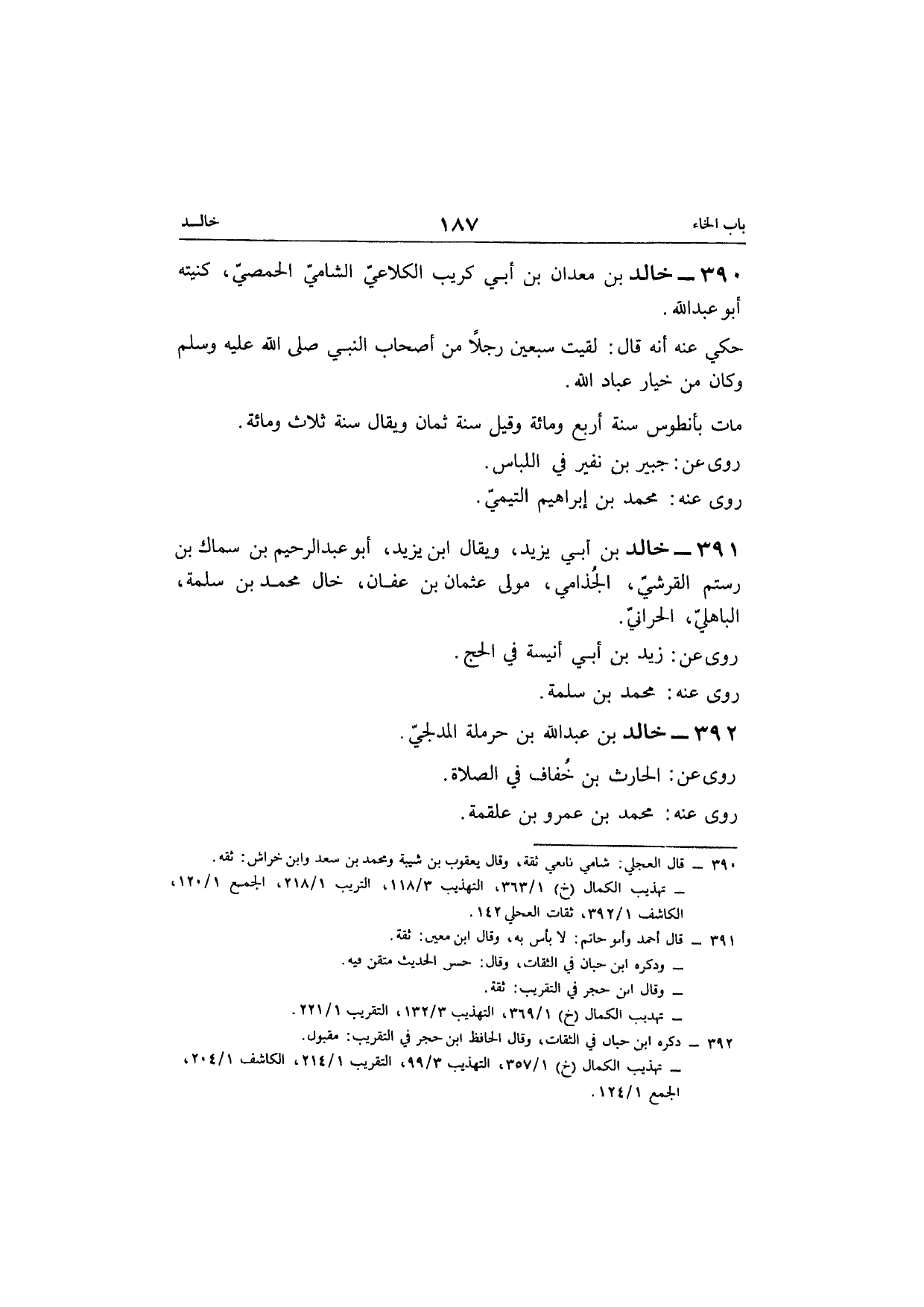 391 - خَالِد بن أبي يزِيد وَيُقَال ابْن يزِيد أَبُو عبد الرحيم بن سماك بن رستم الْقرشِي الجذامي مولى عُثْمَان بن عَفَّان خَال مُحَمَّد بن سَلمَة الْبَاهِلِيّ الْحَرَّانِي