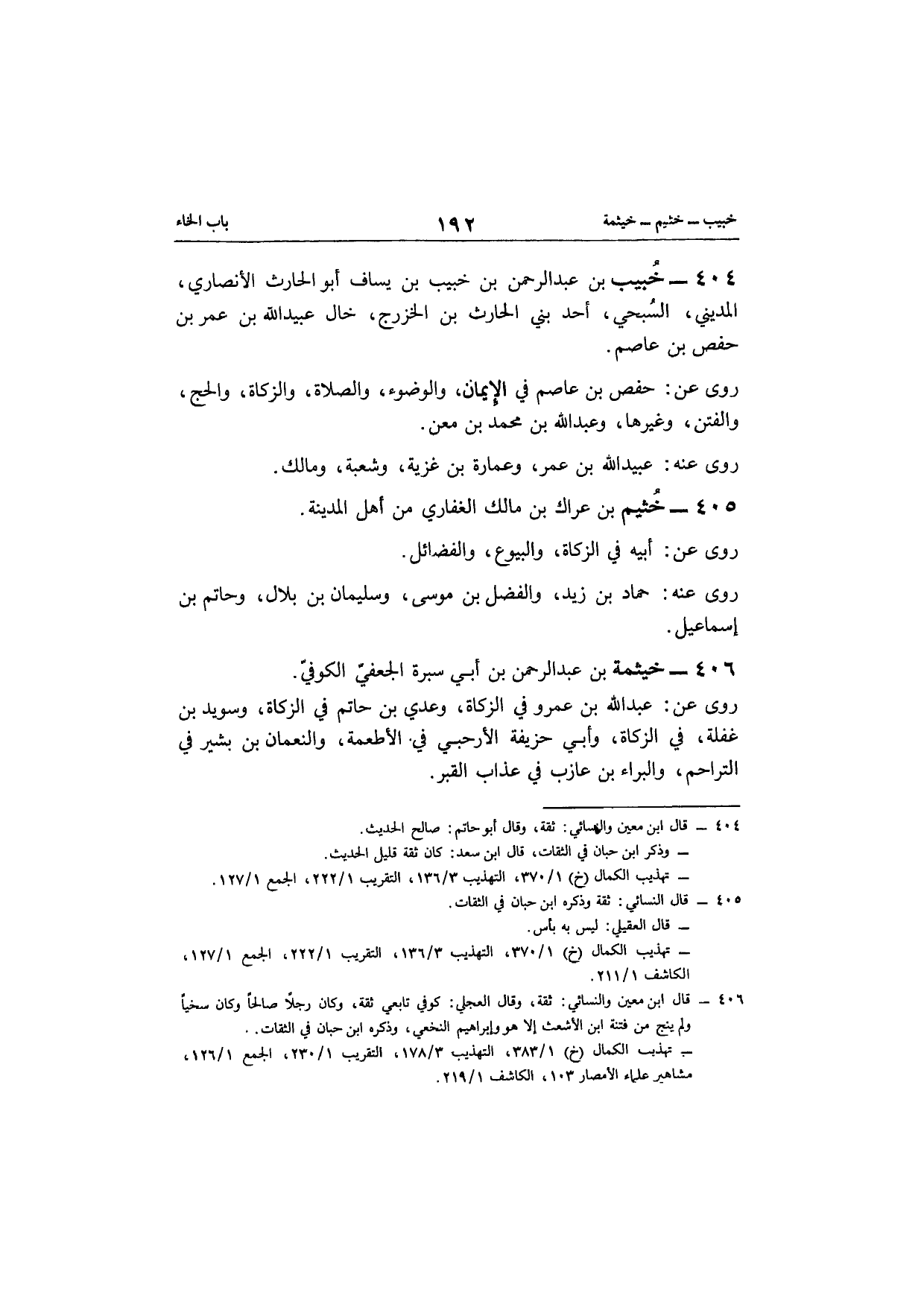 404 - خبيب بن عبد الرحمن بن خبيب بن يسَاف أَبُو الْحَارِث الْأنْصَارِيّ الْمَدِينِيّ السبحي أحد بني الْحَارِث بن الْخَزْرَج خَال عبيد الله بن عمر بن حَفْص بن عَاصِم