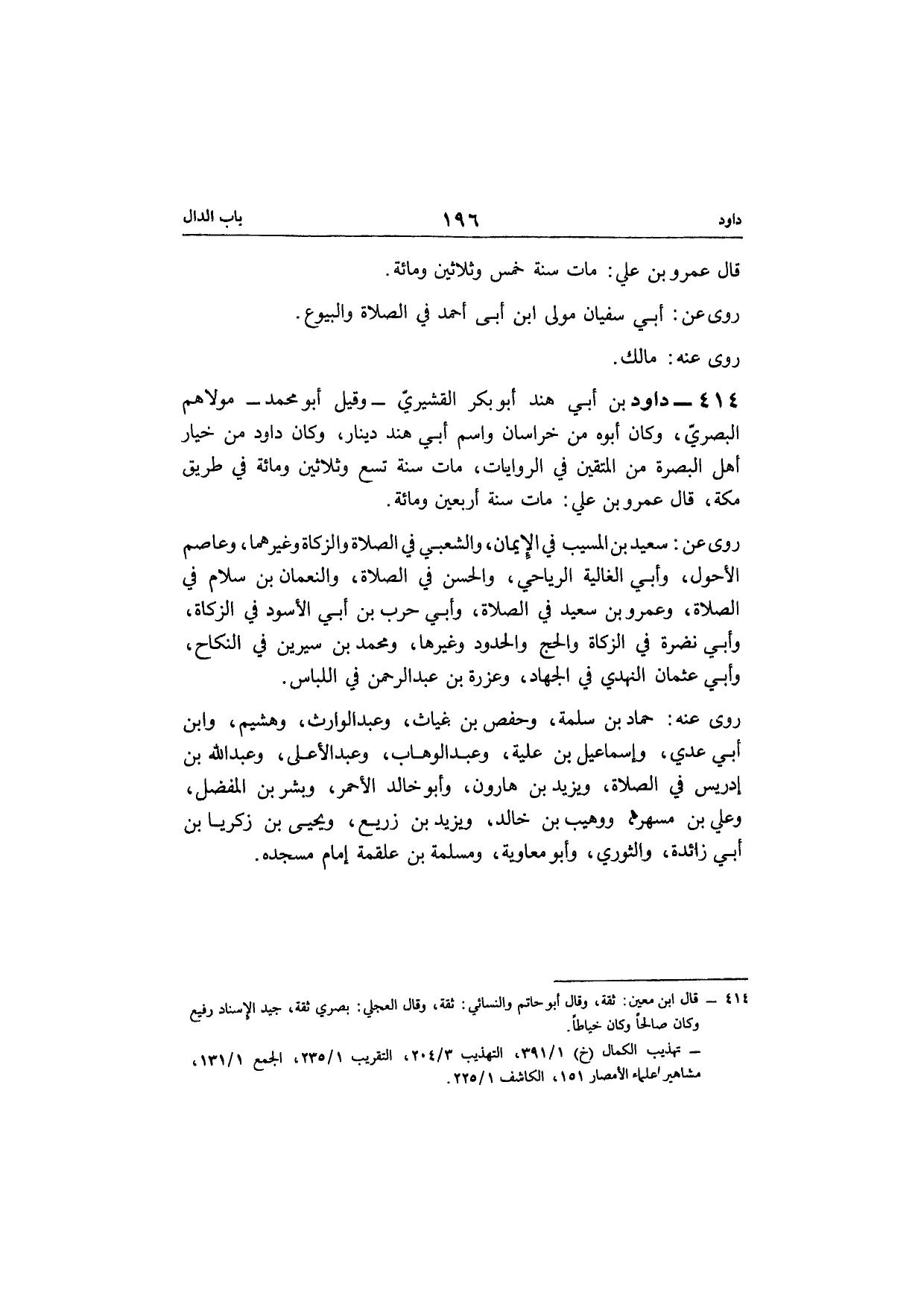 414 - دَاوُد بن أبي هِنْد أَبُو بكر الْقشيرِي وَقيل أَبُو مُحَمَّد مَوْلَاهُم الْبَصْرِيّ وَكَانَ أَبوهُ من خُرَاسَان وَاسم أبي هِنْد دِينَار وَكَانَ دَاوُد من خِيَار أهل الْبَصْرَة من الْمُتَّقِينَ فِي الرِّوَايَات مَاتَ سنة تسع وَثَلَاثِينَ وَمِائَة فِي طَرِيق مَكَّة قَالَ عَمْرو بن عَليّ مَاتَ سنة أَرْبَعِينَ وَمِائَة