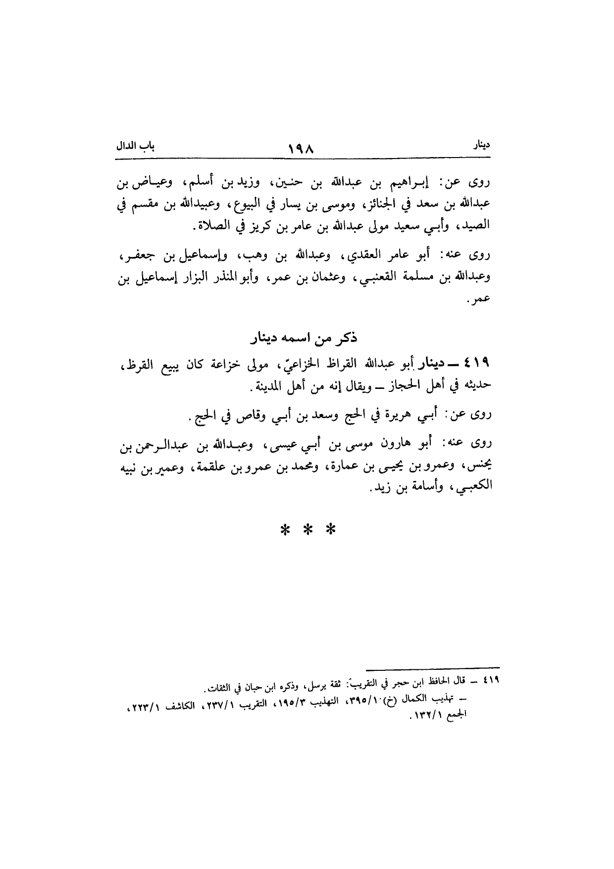 419 - دِينَار أَبُو عبد الله الْقَرَّاظ الْخُزَاعِيّ مولى خُزَاعَة كَانَ يَبِيع الْقرظ حَدِيثه فِي أهل الْحجاز وَيُقَال إِنَّه من أهل الْمَدِينَة