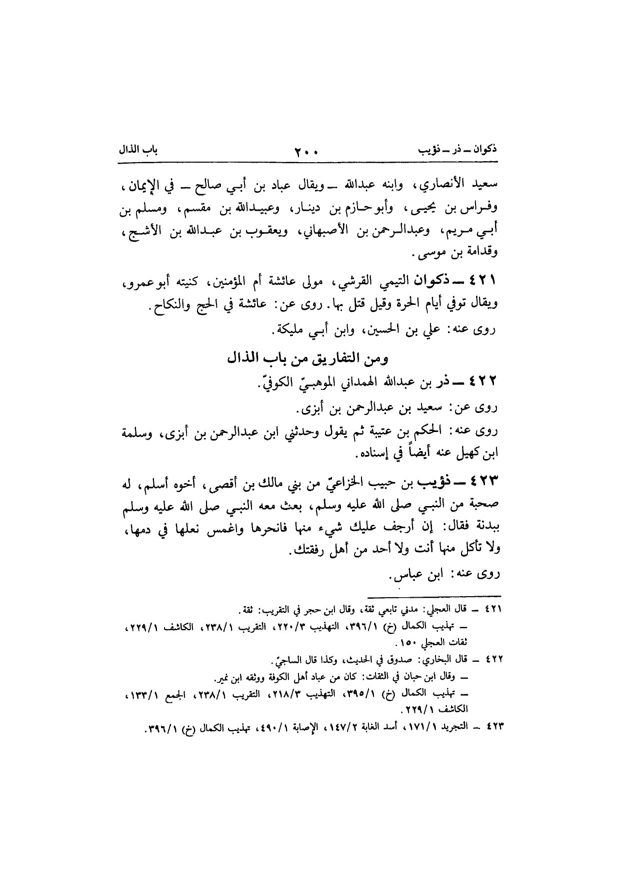 421 - ذكْوَان التَّيْمِيّ الْقرشِي مولى عَائِشَة أم الْمُؤمنِينَ كنيته أَبُو عَمْرو وَيُقَال توفّي أَيَّام الْحرَّة وَقيل قتل بهَا روى عَن عَائِشَة فِي الْحَج وَالنِّكَاح