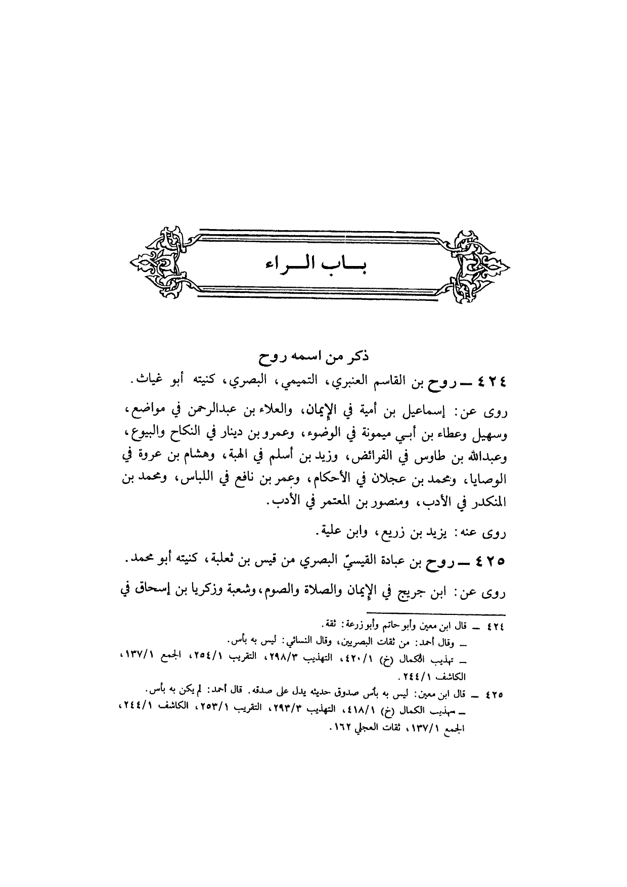 425 - روح بن عبَادَة الْقَيْسِي الْبَصْرِيّ من قيس بن ثَعْلَبَة كنيته أَبُو مُحَمَّد