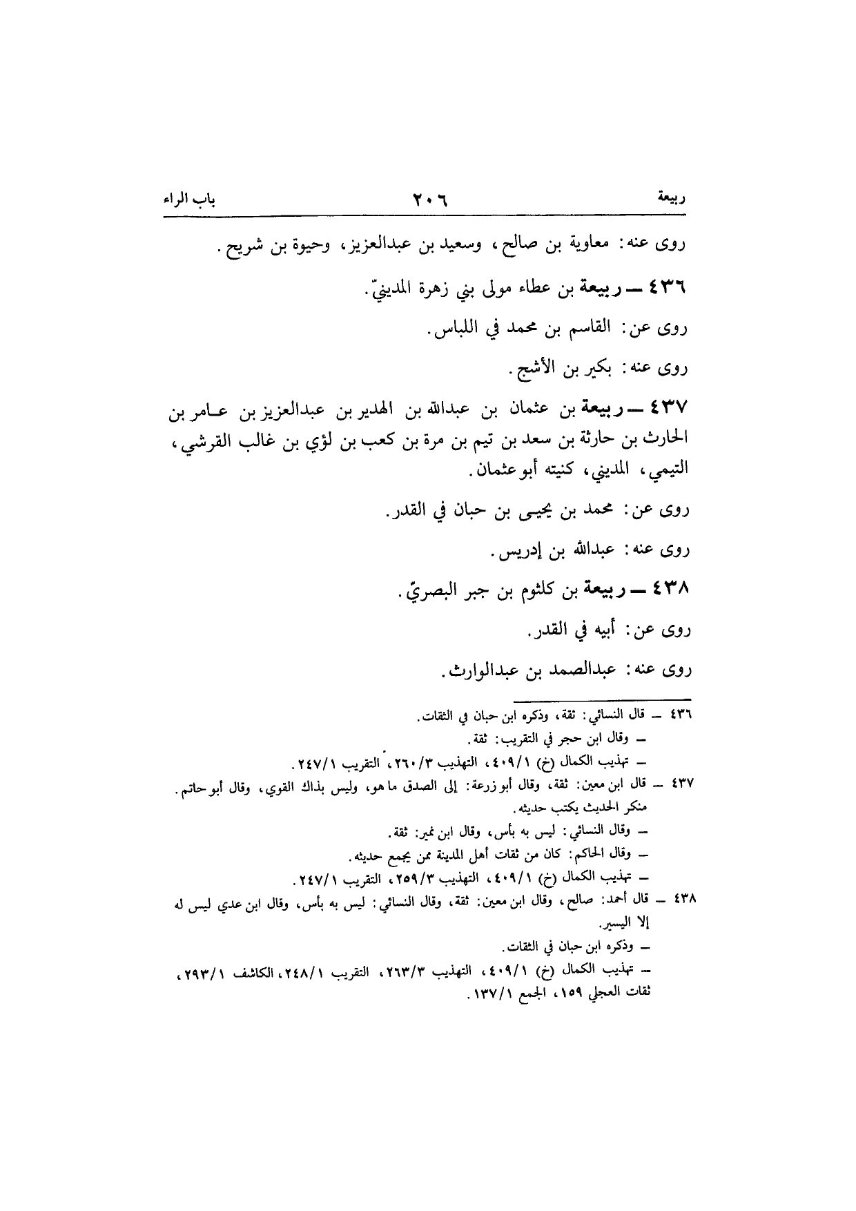 437 - ربيعَة بن عُثْمَان بن عبد الله بن الهدير بن عبد العزيز بن عَامر بن الْحَارِث بن حَارِثَة بن سعد بن تيم بن مرّة بن كَعْب بن لؤَي بن غَالب الْقرشِي التَّيْمِيّ الْمَدِينِيّ كنيته أَبُو عُثْمَان
