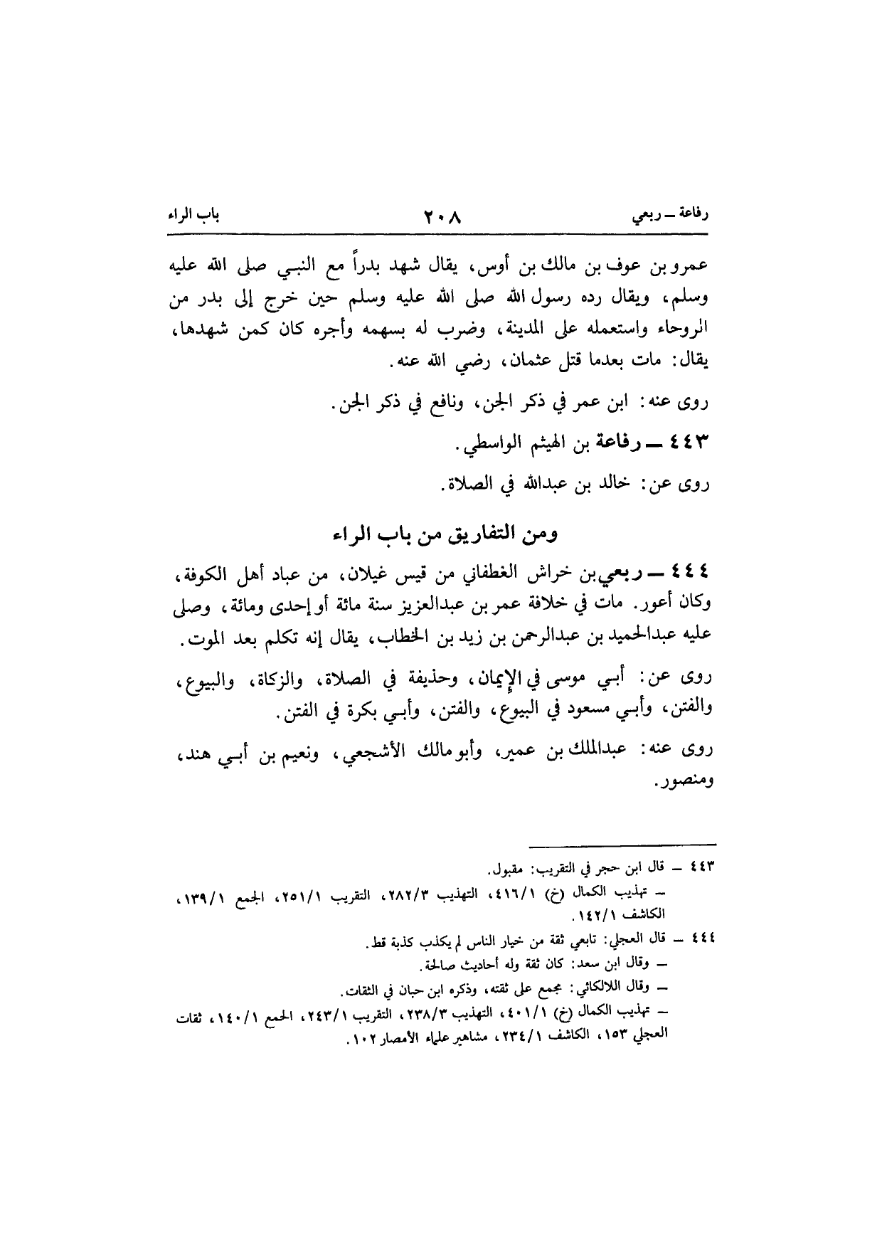 444 - ربعي بن خرَاش الْغَطَفَانِي من قيس غيلَان من عباد أهل الْكُوفَة وَكَانَ أَعور مَاتَ فِي خلَافَة عمر بن عبد العزيز سنة مائَة أَو إِحْدَى وَمِائَة وَصلى عَلَيْهِ عبد الحميد بن عبد الرحمن بن زيد بن الْخطاب يُقَال إِنَّه تكلم بعد الْمَوْت