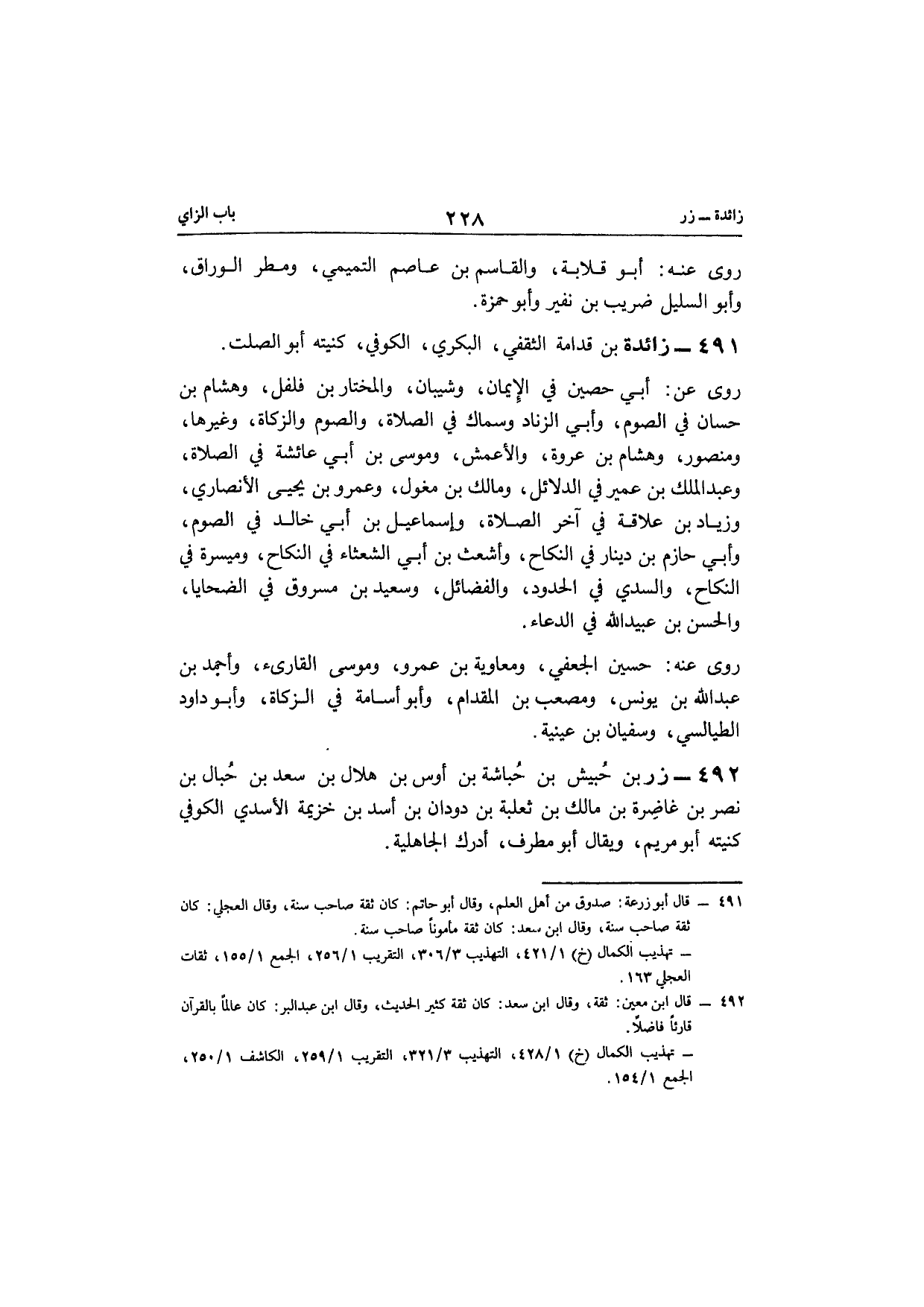 491 - زَائِدَة بن قدامَة الثَّقَفِيّ الْبكْرِيّ الْكُوفِي كنيته أَبُو الصَّلْت