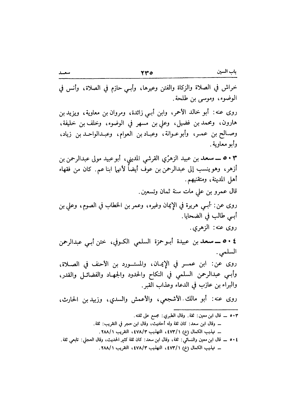 503 - سعد بن عبيد الزهري الْقرشِي الْمَدِينِيّ أَبُو عبيد مولى عبد الرحمن بن أَزْهَر وَهُوَ ينْسب إِلَى عبد الرحمن بن عَوْف أَيْضا لِأَنَّهُمَا ابناء عَم كَانَ من فُقَهَاء أهل الْمَدِينَة ومتقنيهم