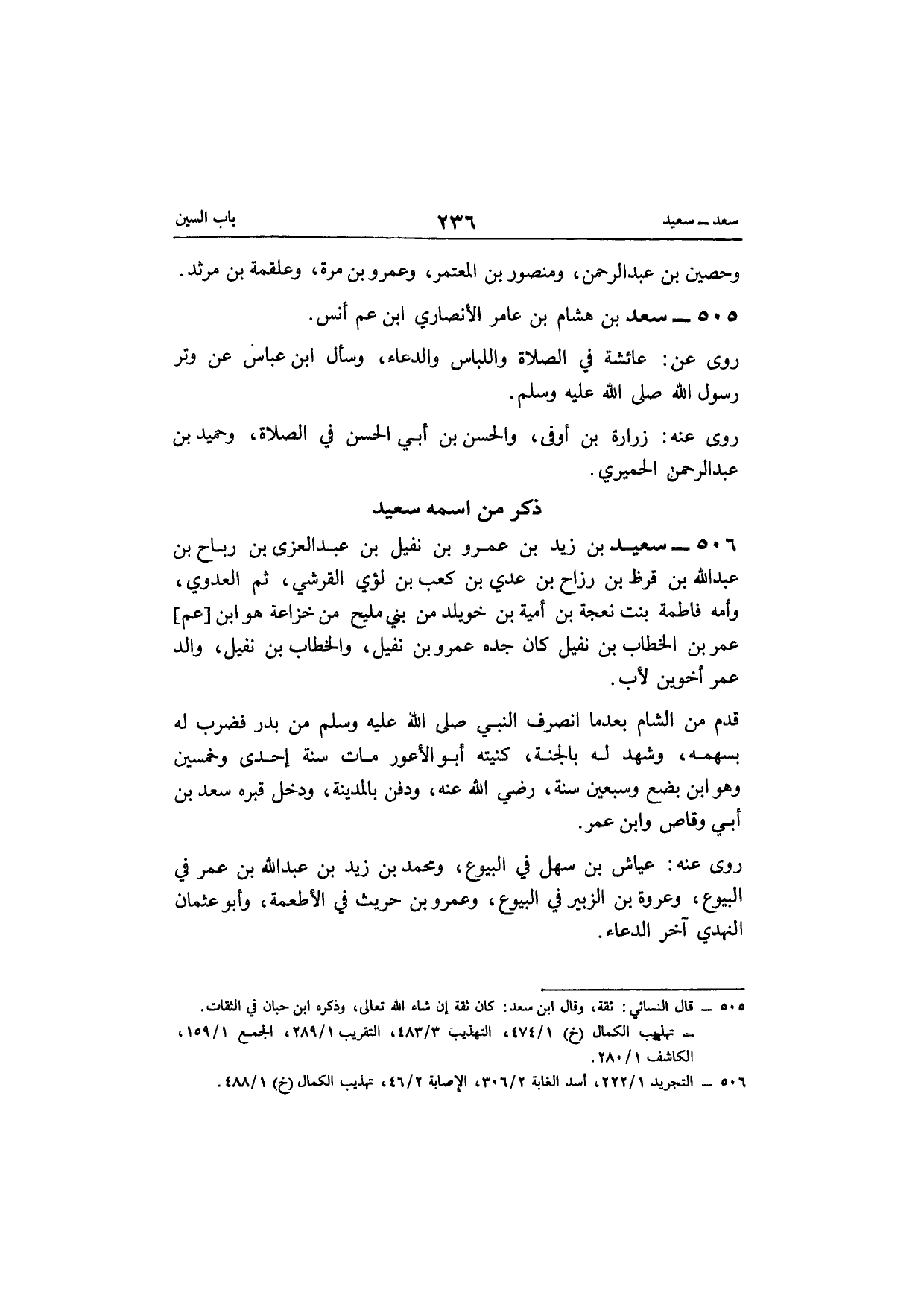 506 - سعيد بن زيد بن عَمْرو بن نفَيْل بن عبد العزى بن رَبَاح بن عبد الله بن قرظ بن رزاح بن عدي بن كَعْب بن لؤَي الْقرشِي ثمَّ الْعَدوي وَأمه فَاطِمَة بنت نعجة بن أُميَّة بن خويلد من بني مليح من خُزَاعَة هُوَ ابْن (عَم) عمر بن الْخطاب بن نفَيْل كَانَ جده عَمْرو بن نفَيْل وَالْخطاب بن نفَيْل وَالِد عمر أَخَوَيْنِ لأَب