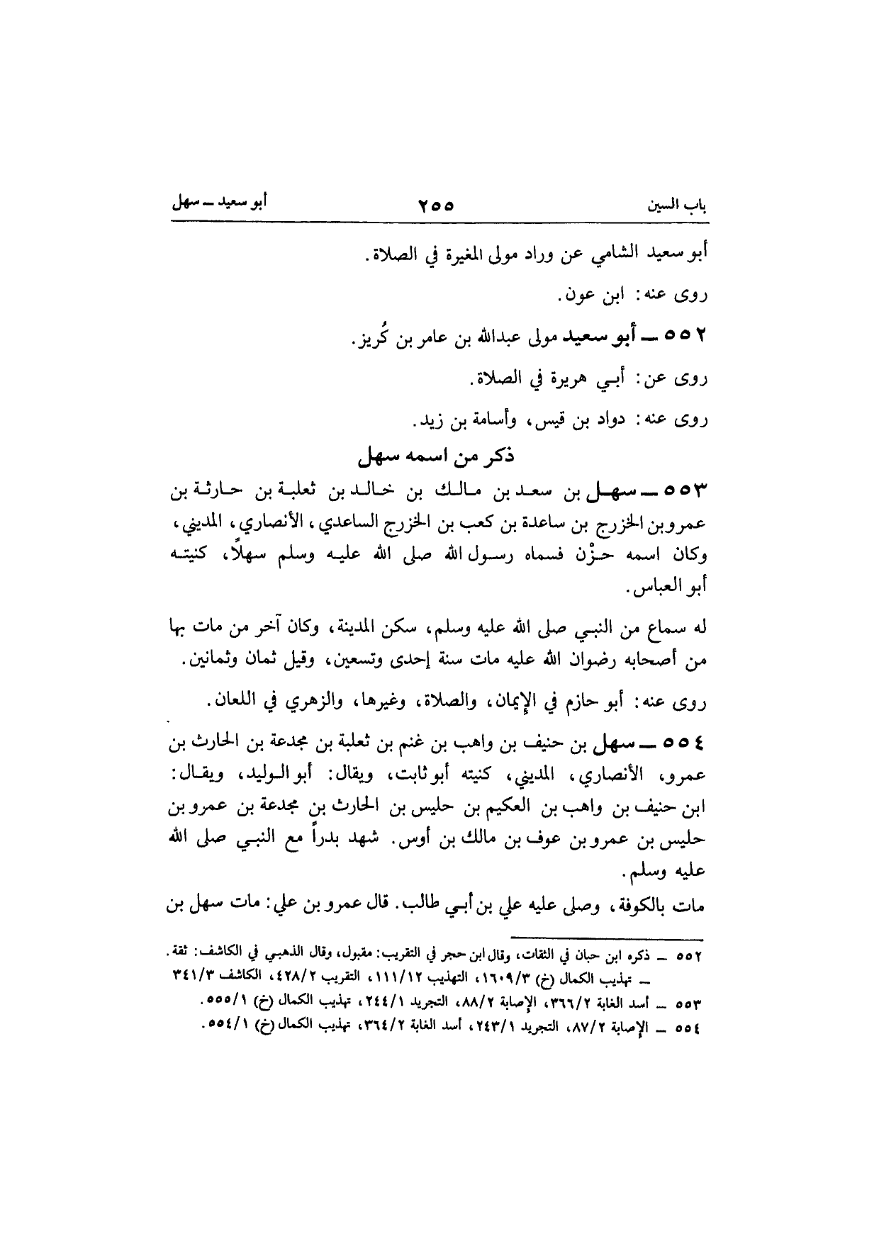 554 - سهل بن حنيف بن واهب بن غنم بن ثَعْلَبَة بن مجدعة بن الْحَارِث بن عَمْرو الْأنْصَارِيّ الْمَدِينِيّ كنيته أَبُو ثَابت وَيُقَال أَبُو الْوَلِيد وَيُقَال ابْن حنيف بن واهب بن العكيم بن حليس بن الْحَارِث بن مجدعة بن عَمْرو بن حليس بن عَمْرو بن عَوْف بن مَالك بن أَوْس شهد بَدْرًا مَعَ النَّبِي صلى الله عَلَيْهِ وَسلم