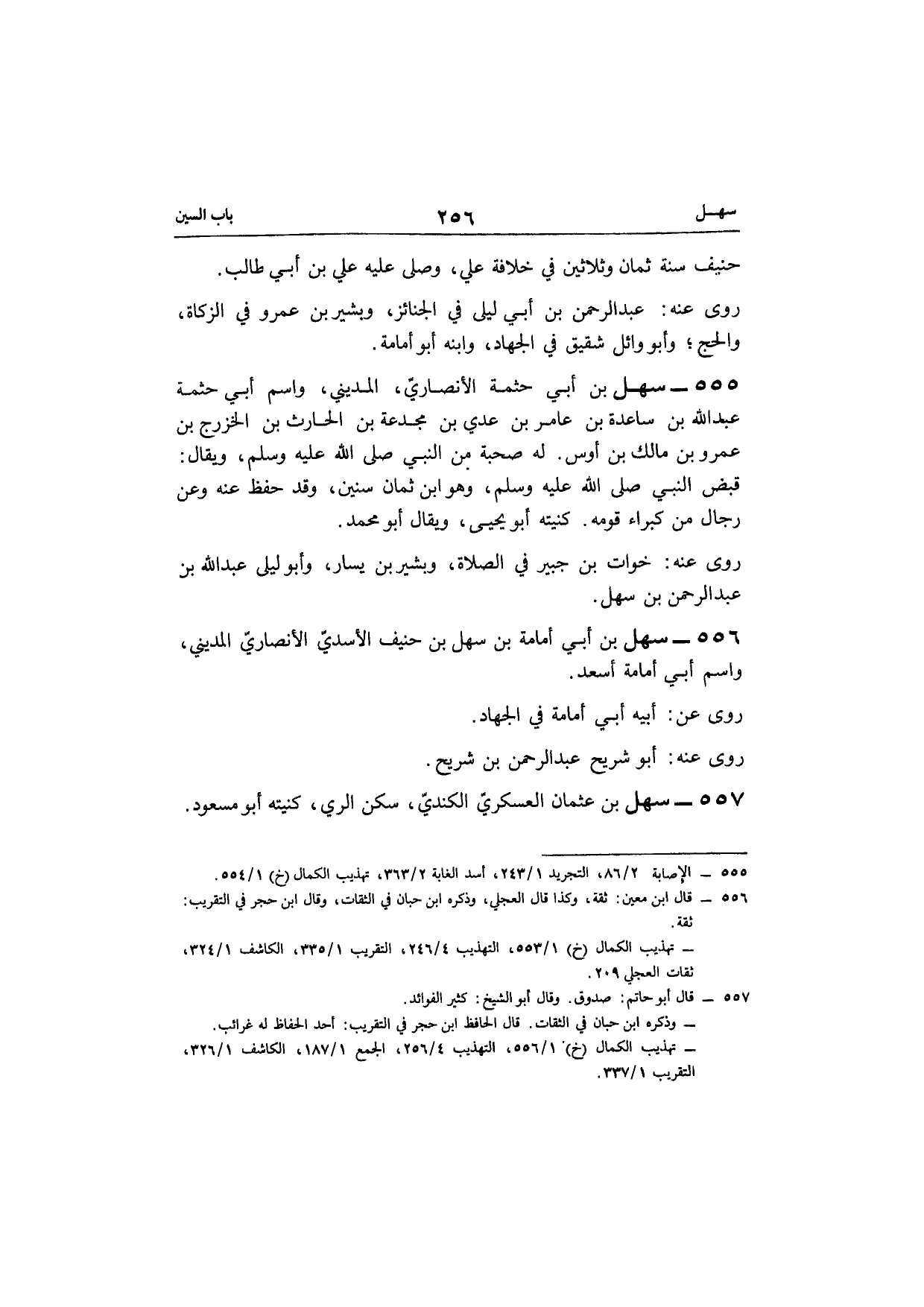 555 - سهل بن أبي حثْمَة الْأنْصَارِيّ الْمَدِينِيّ وَاسم أبي حثْمَة عبد الله بن سَاعِدَة بن عَامر بن عدي بن مجدعة بن الْحَارِث بن الْخَزْرَج بن عَمْرو بن مَالك بن أَوْس لَهُ صُحْبَة من النَّبِي صلى الله عَلَيْهِ وَسلم وَيُقَال قبض النَّبِي صلى الله عَلَيْهِ وَسلم وَهُوَ ابْن ثَمَان سِنِين وَقد حفظ عَنهُ وَعَن رجال من كبراء قومه كنيته أَبُو يحيى وَيُقَال أَبُو مُحَمَّد