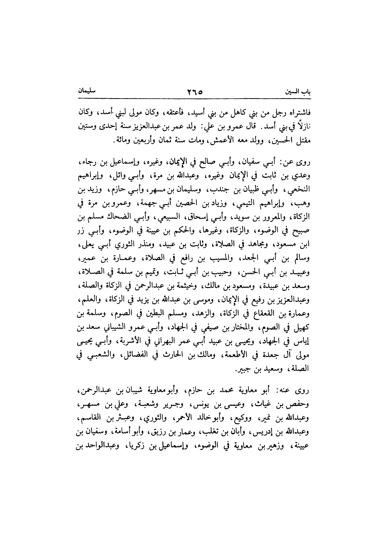 فَاشْتَرَاهُ رجل من بني كَاهِل من بني أسيد فَأعْتقهُ وَكَانَ مولى لبني أَسد وَكَانَ نازلا فِي بني أَسد قَالَ عَمْرو بن عَليّ ولد عمر بن عبد العزيز سنة إِحْدَى وَسِتِّينَ مقتل الْحُسَيْن وَولد مَعَه الْأَعْمَش وَمَات سنة ثَمَان وَأَرْبَعين وَمِائَة