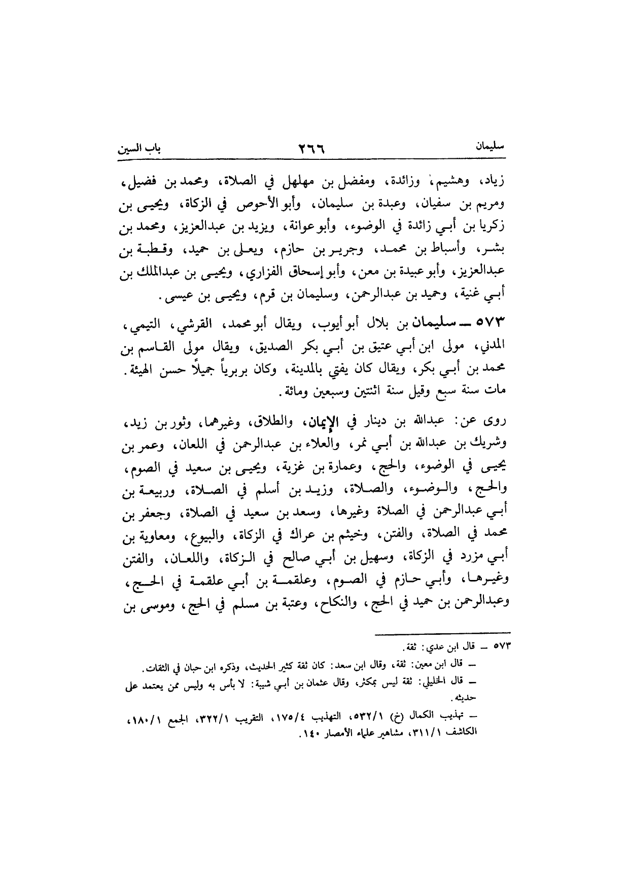 573 - سُلَيْمَان بن بِلَال أَبُو أَيُّوب وَيُقَال أَبُو مُحَمَّد الْقرشِي التَّيْمِيّ الْمدنِي مولى ابْن أبي عَتيق بن أبي بكر الصّديق وَيُقَال مولى الْقَاسِم بن مُحَمَّد بن أبي بكر وَيُقَال كَانَ يُفْتِي بِالْمَدِينَةِ وَكَانَ بربريا جميلا حسن الْهَيْئَة مَاتَ سنة سبع وَقيل سنة اثْنَتَيْنِ وَسبعين وَمِائَة