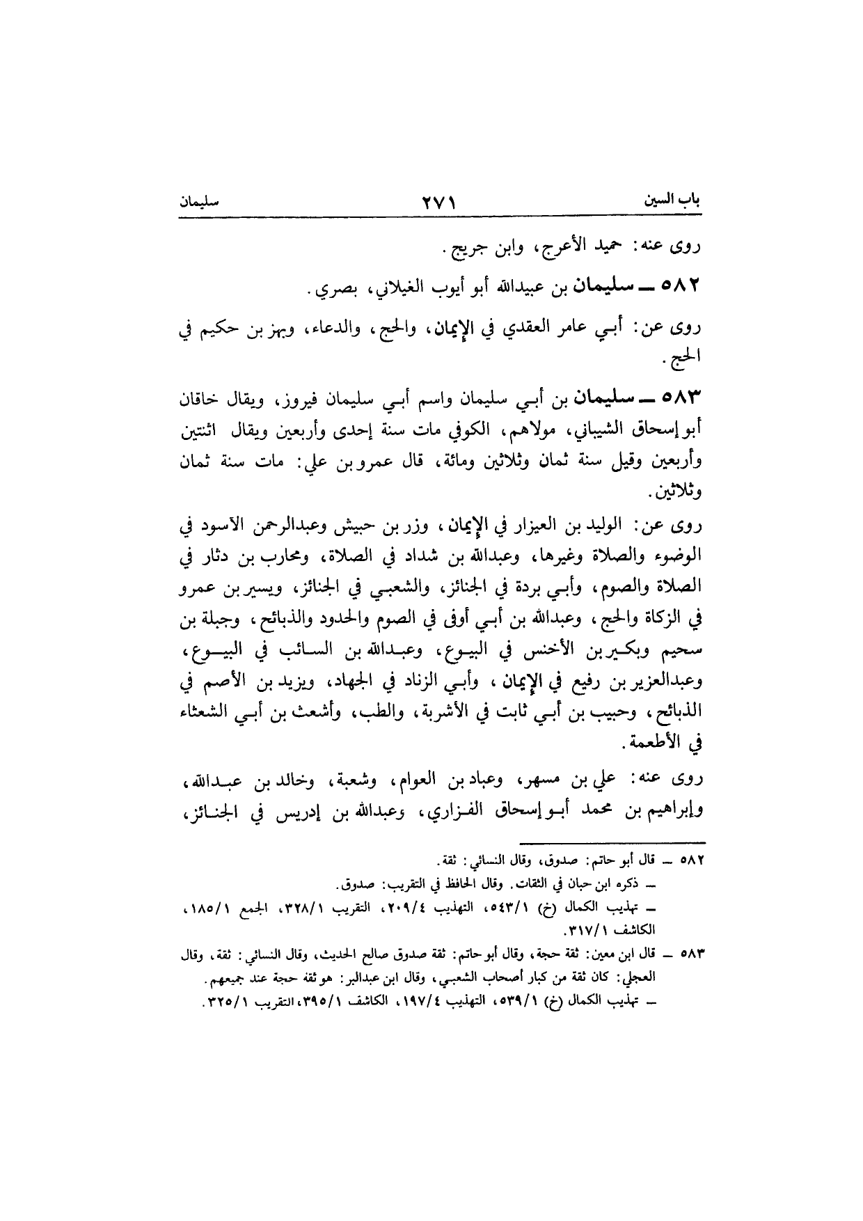 583 - سُلَيْمَان بن أبي سُلَيْمَان وَاسم أبي سُلَيْمَان فَيْرُوز وَيُقَال خاقَان أَبُو إِسْحَاق الشَّيْبَانِيّ مَوْلَاهُم الْكُوفِي مَاتَ سنة إِحْدَى وَأَرْبَعين وَيُقَال أثنتين وَأَرْبَعين وَقيل سنة ثَمَان وَثَلَاثِينَ وَمِائَة قَالَ عَمْرو بن عَليّ مَاتَ سنة ثَمَان وَثَلَاثِينَ