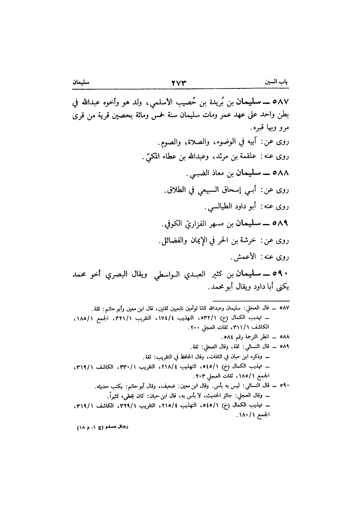 587 - سُلَيْمَان بن بُرَيْدَة بن حصيب الْأَسْلَمِيّ ولد هُوَ وَأَخُوهُ عبد الله فِي بطن وَاحِد على عهد عمر وَمَات سُلَيْمَان سنة خمس وَمِائَة بحصين قَرْيَة من قرى مرو وَبهَا قَبره