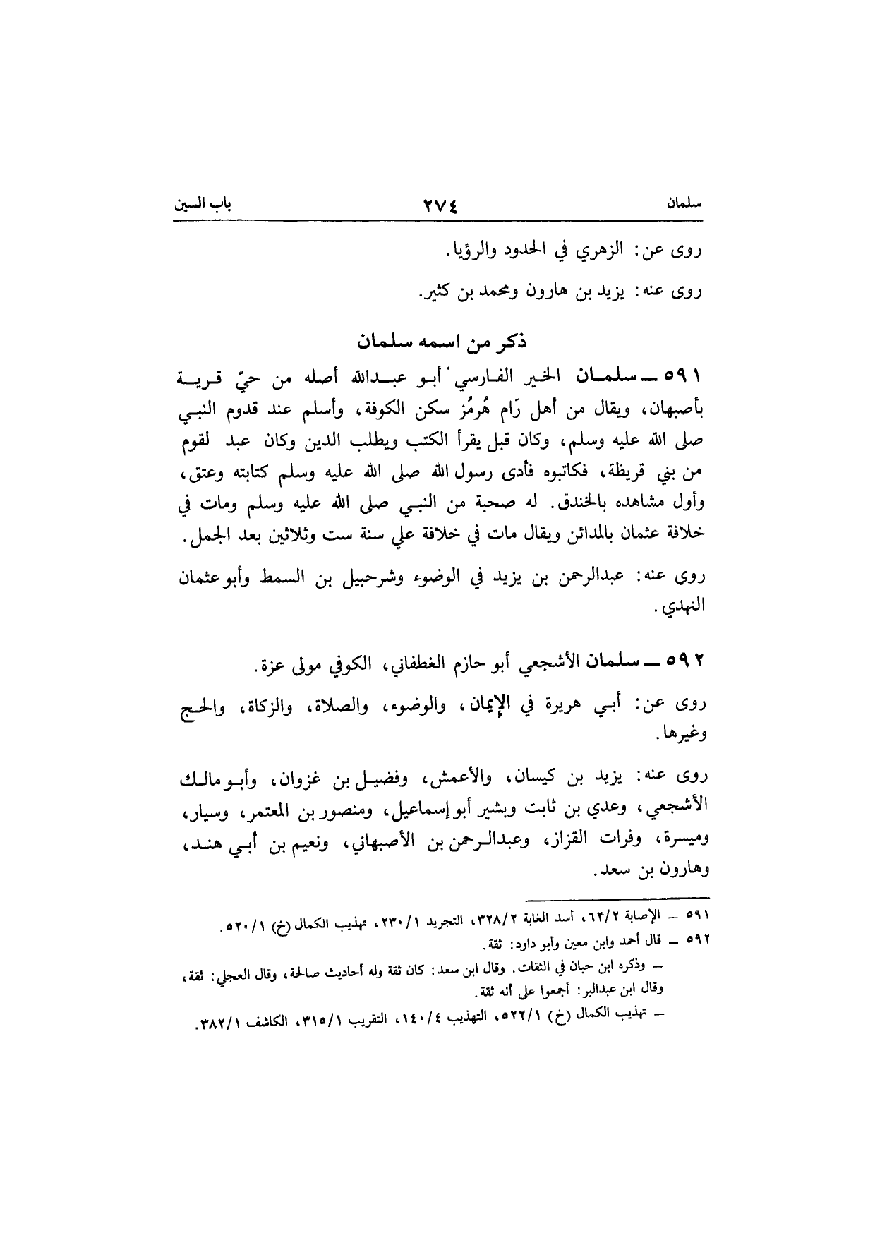 591 - سلمَان الْخَيْر الْفَارِسِي أَبُو عبد الله أَصله من حَيّ قَرْيَة بأصبهان وَيُقَال من أهل رام هُرْمُز سكن الْكُوفَة وَأسلم عَن قدوم النَّبِي صلى الله عَلَيْهِ وَسلم وَكَانَ قبل يقْرَأ الْكتب وَيطْلب الدّين وَكَانَ عبد لقوم من بني قُرَيْظَة فكاتبوه فَأدى رَسُول الله صلى الله عَلَيْهِ كِتَابَته وَعتق وَأول مشاهده بالخندق لَهُ صُحْبَة من النَّبِي صلى الله عَلَيْهِ وَسلم وَمَات فِي خلَافَة عُثْمَان بِالْمَدَائِنِ وَيُقَال مَاتَ فِي خلَافَة عَليّ سنة سِتّ وَثَلَاثِينَ بعد الْجمل