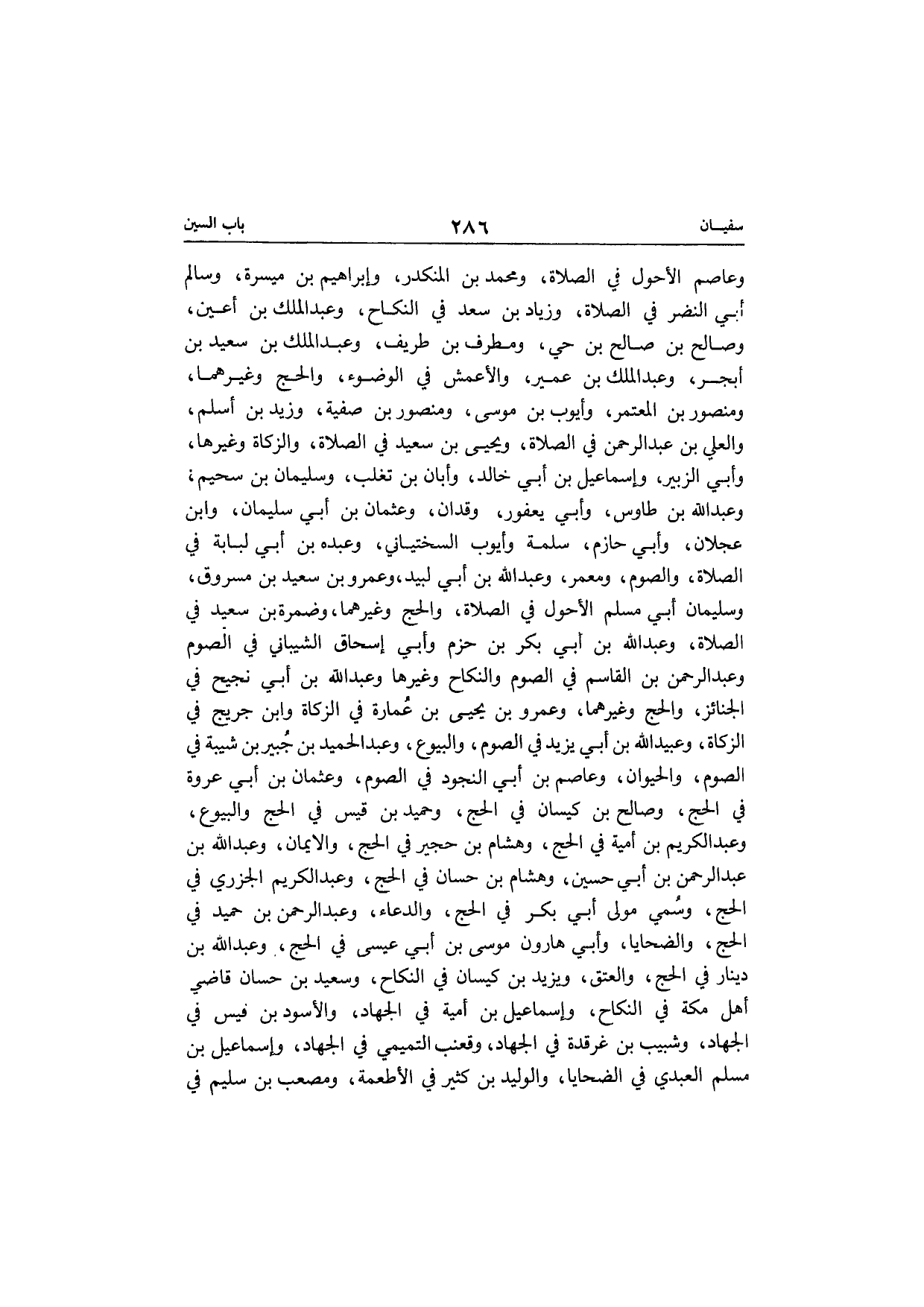 وَعَاصِم الْأَحول فِي الصَّلَاة وَمُحَمّد بن الْمُنْكَدر وَإِبْرَاهِيم بن ميسرَة وَسَالم أبي النَّضر فِي الصَّلَاة وَزِيَاد بن سعد فِي النِّكَاح وعبد الملك بن أعين وَصَالح بن صَالح بن حَيّ ومطرف بن طريف وعبد الملك بن سعيد بن أبجر وعبد الملك بن عُمَيْر وَالْأَعْمَش فِي الْوضُوء وَالْحج وَغَيرهمَا وَمَنْصُور بن الْمُعْتَمِر وَأَيوب بن مُوسَى وَمَنْصُور بن صَفِيَّة وَزيد بن أسلم والعلي بن عبد الرحمن فِي الصَّلَاة وَيحيى بن سعيد فِي الصَّلَاة وَالزَّكَاة وَغَيرهَا وَأبي الزبير وَإِسْمَاعِيل بن أبي خَالِد وَأَبَان بن تغلب وَسليمَان بن سحيم وعبد الله بن طَاوس وَأبي يَعْفُور وقدان وَعُثْمَان بن أبي سُلَيْمَان وَابْن عجلَان وَأبي حَازِم سَلمَة وَأَيوب السّخْتِيَانِيّ وَعَبده بن أبي لبَابَة فِي الصَّلَاة وَالصَّوْم وَمعمر وعبد الله بن أبي لبيد وَعَمْرو بن سعيد بن مَسْرُوق وَسليمَان أبي مُسلم الْأَحول فِي الصَّلَاة وَالْحج وَغَيرهمَا وضمرة بن سعيد فِي الصَّلَاة وعبد الله بن أبي بكر بن حزم وَأبي إِسْحَاق الشَّيْبَانِيّ فِي الصَّوْم وعبد الرحمن بن الْقَاسِم فِي الصَّوْم وَالنِّكَاح وَغَيرهَا وعبد الله بن أبي نجيح فِي الْجَنَائِز وَالْحج وَغَيرهمَا وَعَمْرو بن يحيى بن عمَارَة فِي الزَّكَاة وَابْن جريج فِي الزَّكَاة وعبيد الله بن أبي يزِيد فِي الصَّوْم والبيوع وعبد الحميد بن جُبَير بن شيبَة فِي الصَّوْم وَالْحَيَوَان وَعَاصِم بن أبي النجُود فِي الصَّوْم وَعُثْمَان بن أبي عُرْوَة فِي الْحَج وَصَالح بن كيسَان فِي الْحَج وَحميد بن قيس فِي الْحَج والبيوع وعبد الكريم بن أُميَّة فِي الْحَج وَهِشَام بن حُجَيْر فِي الْحَج وَالْإِيمَان وعبد الله بن عبد الرحمن بن أبي حُسَيْن وَهِشَام بن حسان فِي الْحَج وعبد الكريم الْجَزرِي فِي الْحَج وَسمي مولى أبي بكر فِي الْحَج وَالدُّعَاء وعبد الرحمن بن حميد فِي الْحَج والضحايا وَأبي هَارُون مُوسَى بن أبي عِيسَى فِي الْحَج وعبد الله بن دِينَار فِي الْحَج وَالْعِتْق وَيزِيد بن كيسَان فِي النِّكَاح وَسَعِيد بن حسان قَاضِي أهل مَكَّة فِي النِّكَاح وَإِسْمَاعِيل بن أُميَّة فِي الْجِهَاد وَالْأسود بن فيس فِي الْجِهَاد وشبيب بن غرقدة فِي الْجِهَاد وقعنب التَّمِيمِي فِي الْجِهَاد وَإِسْمَاعِيل بن مُسلم الْعَبْدي فِي الضَّحَايَا والوليد بن كثير فِي الْأَطْعِمَة وَمصْعَب بن سليم فِي