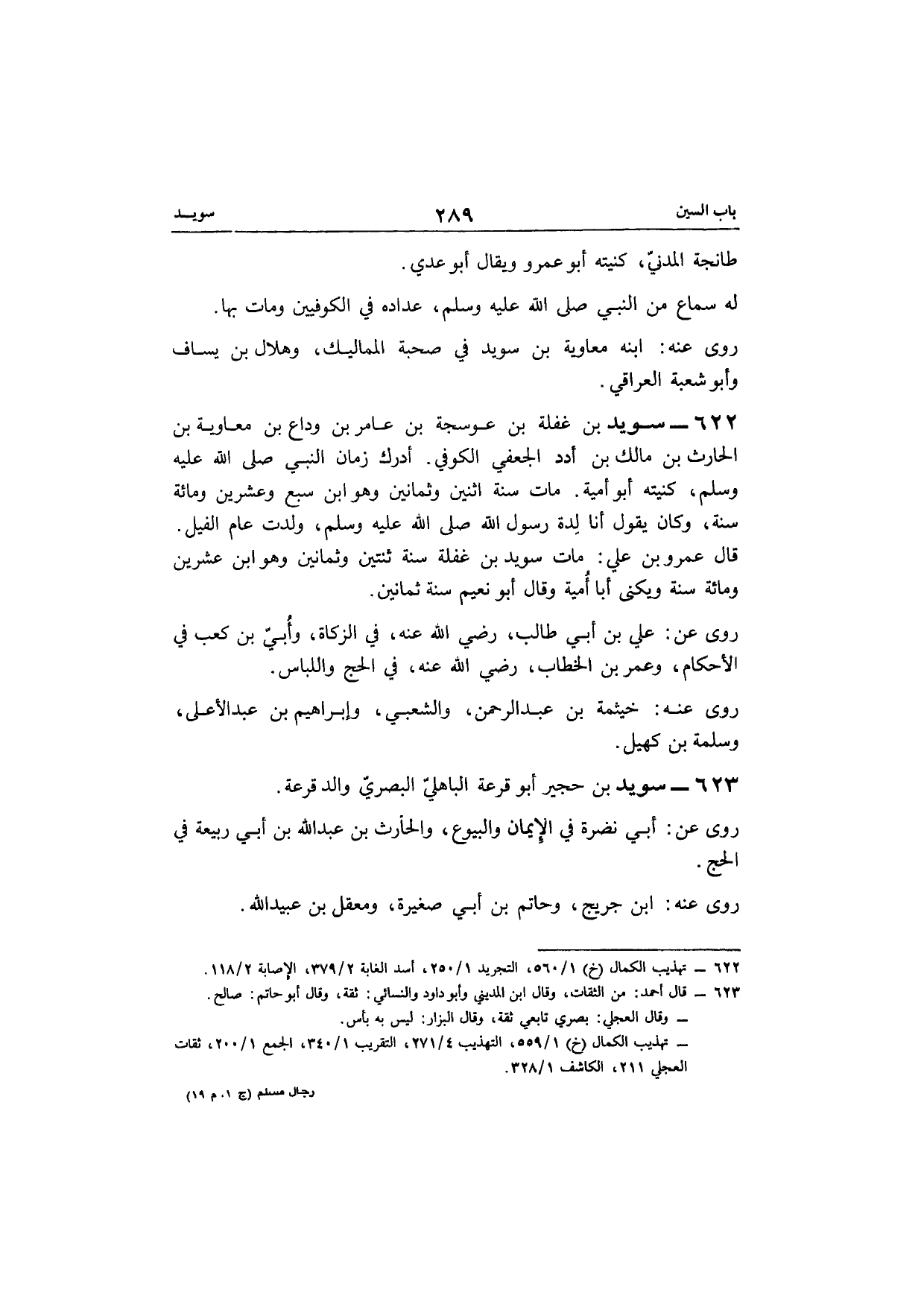 622 - سُوَيْد بن غَفلَة بن عَوْسَجَة بن عَامر بن وداع بن مُعَاوِيَة بن الْحَارِث بن مَالك بن أدد الْجعْفِيّ الْكُوفِي أدْرك زمَان النَّبِي صلى الله عَلَيْهِ وَسلم كنيته أَبُو أُميَّة مَاتَ سنة اثْنَيْنِ وَثَمَانِينَ وَهُوَ ابْن سبع وَعشْرين وَمِائَة سنة وَكَانَ يَقُول أَنا لِدَة رَسُول الله صلى الله عَلَيْهِ وَسلم ولدت عَام الْفِيل قَالَ عَمْرو بن عَليّ مَاتَ سُوَيْد بن غَفلَة سنة ثِنْتَيْنِ وَثَمَانِينَ وَهُوَ ابْن عشْرين وَمِائَة سنة ويكنى أَبَا أُميَّة وَقَالَ أَبُو نعيم سنة ثَمَانِينَ
