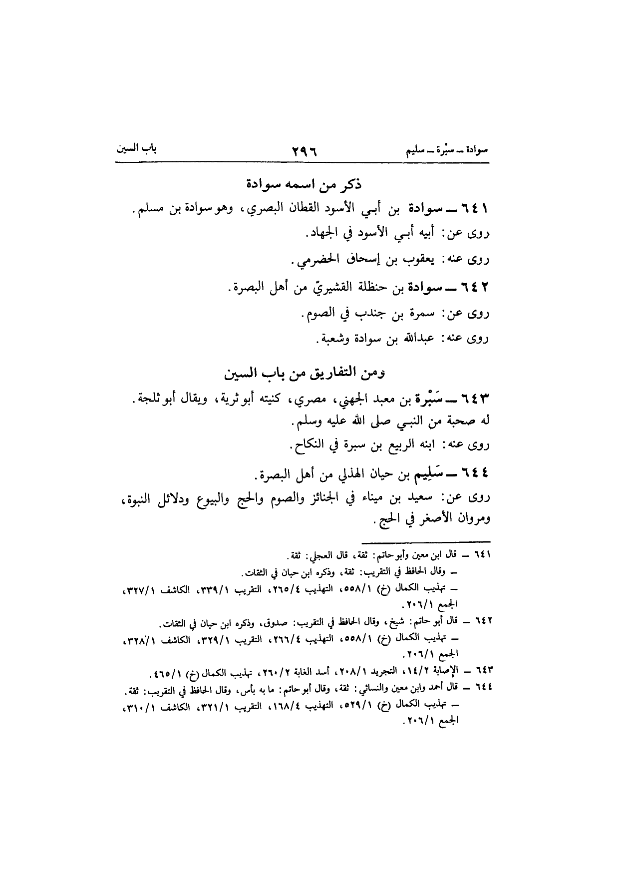 643 - سُبْرَة بن معبد الْجُهَنِيّ مصري كنيته أَبُو ثرية وَيُقَال أَبُو ثلجة لَهُ صُحْبَة من النَّبِي صلى الله عَلَيْهِ وَسلم