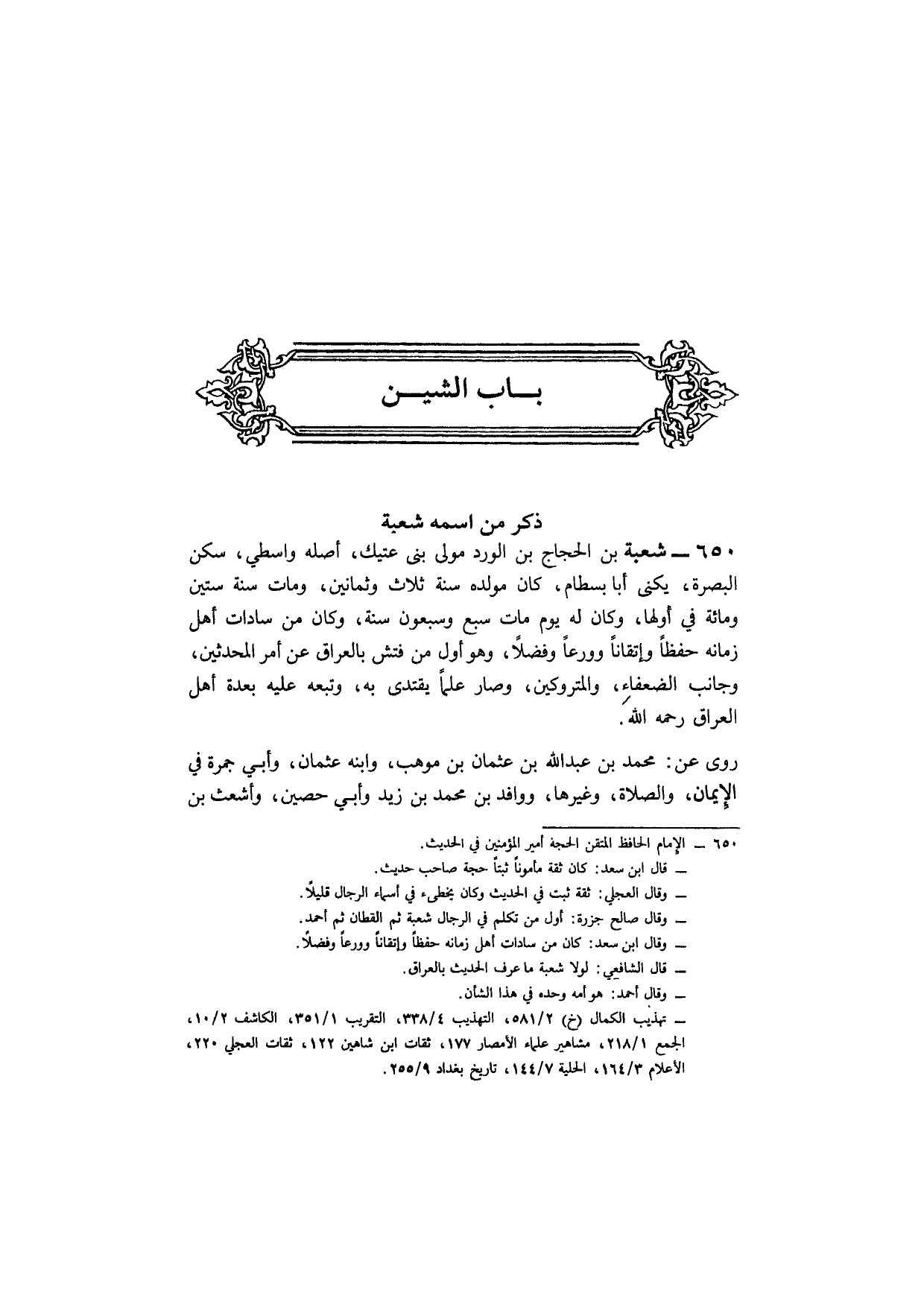 650 - شُعْبَة بن الْحجَّاج بن الْورْد مولى بني عتِيك أَصله واسطي سكن الْبَصْرَة يكنى أَبَا بسطَام كَانَ مولد سنة ثَلَاث وَثَمَانِينَ وَمَات سنة سِتِّينَ وَمِائَة فِي أَولهَا وَكَانَ لَهُ يَوْم مَاتَ سبع وَسَبْعُونَ سنة وَكَانَ من سَادَات أهل زمانة حفظا وإتقانا وورعا وفضلا وَهُوَ أول من فتش بالعراق عَن أَمر الْمُحدثين وجانب الضُّعَفَاء والمتروكين وَصَارَ علما يقْتَدى بِهِ وَتَبعهُ عَلَيْهِ بعدة أهل الْعرَاق رَحمَه الله
