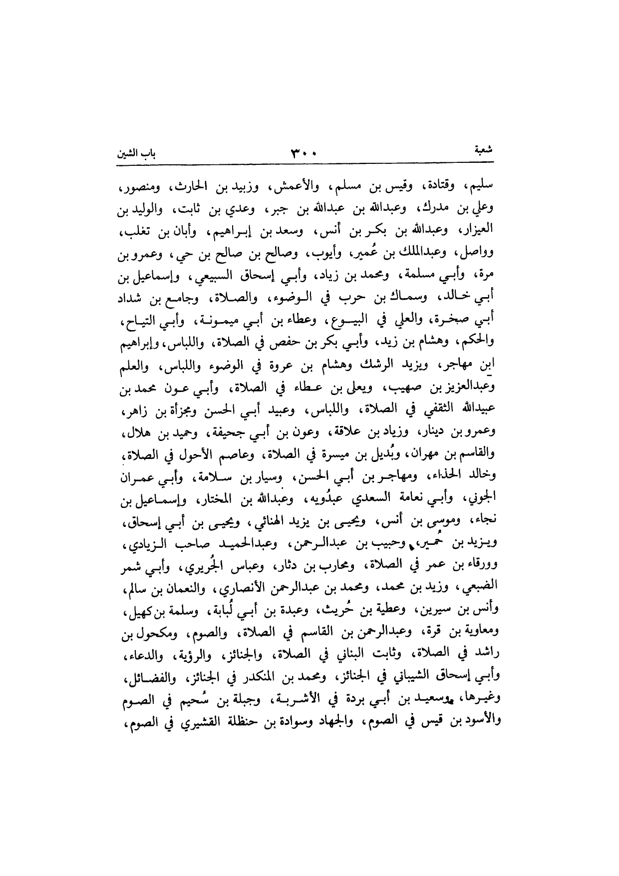 سليم وَقَتَادَة وَقيس بن مُسلم وَالْأَعْمَش وزبيد بن الْحَارِث وَمَنْصُور وَعلي بن مدرك وعبد الله بن عبد الله بن جبر وعدي بن ثَابت والوليد بن الْعيزَار وعبد الله بن بكر بن أنس وَسعد بن إِبْرَاهِيم وَأَبَان بن تغلب وواصل وعبد الملك بن عُمَيْر وَأَيوب وَصَالح بن حَيّ وَعَمْرو بن مرّة وَأبي مسلمة وَمُحَمّد بن زِيَاد وَأبي إِسْحَاق السبيعِي وَإِسْمَاعِيل بن ابي خَالِد وَسماك بن حَرْب فِي الْوضُوء وَالصَّلَاة وجامع بن شَدَّاد أبي صَخْرَة والعلي فِي الْبيُوع وَعَطَاء بن أبي مَيْمُونَة وَأبي التياح وَالْحكم وَهِشَام بن زيد وَأبي بكر بن حَفْص فِي الصَّلَاة واللباس وَإِبْرَاهِيم ابْن مهَاجر وَيزِيد الرشك وَهِشَام بن عُرْوَة فِي الْوضُوء واللباس وَالْعلم وعبد العزيز بن صُهَيْب ويعلى بن عَطاء فِي الصَّلَاة وَأبي عون مُحَمَّد بن عبيد الله الثَّقَفِيّ فِي الصَّلَاة واللباس وَعبيد أبي الْحسن ومجزأة بن زَاهِر وَعَمْرو بن دِينَار وَزِيَاد بن علاقَة وَعون بن أبي جُحَيْفَة وَحميد بن هِلَال وَالقَاسِم بن مهْرَان وَبُدَيْل بن ميسرَة فِي الصَّلَاة وَعَاصِم الْأَحول فِي الصَّلَاة وخَالِد الْحذاء ومهاجر بن أبي الْحسن وسيار بن سَلامَة وَأبي عمرَان الْجونِي وَأبي نعَامَة السَّعْدِيّ عبدويه وعبد الله بن الْمُخْتَار وَإِسْمَاعِيل بن نجاء ومُوسَى بن أنس وَيحيى بن يزِيد الْهنائِي وَيحيى بن أبي إِسْحَاق وَيزِيد بن حمير وحبِيب بن عبد الرحمن وعبد الحميد صَاحب الزيَادي وورقاء بن عمر فِي الصَّلَاة ومحارب بن دثار وعباس الْجريرِي وَأبي شمر الضبعِي وَزيد بن مُحَمَّد وَمُحَمّد بن عبد الرحمن الْأنْصَارِيّ والنعمان بن سَالم وَأنس بن سِيرِين وعطية بن حُرَيْث وَعَبده بن أبي لبَابَة وَسَلَمَة بن كهيل وَمُعَاوِيَة بن قُرَّة وعبد الرحمن بن الْقَاسِم فِي الصَّلَاة وَالصَّوْم وَمَكْحُول بن رَاشد فِي الصَّلَاة وثابت الْبنانِيّ فِي الصَّلَاة والجنائز والرؤية وَالدُّعَاء وَأبي إِسْحَاق الشَّيْبَانِيّ فِي الْجَنَائِز وَمُحَمّد بن الْمُنْكَدر فِي الْجَنَائِز والفضائل وَغَيرهَا وَسَعِيد بن أبي بردة فِي الْأَشْرِبَة وجبلة بن سحيم فِي الصَّوْم وَالْأسود بن قيس فِي الصَّوْم وَالْجهَاد وسوادة بن حَنْظَلَة الْقشيرِي فِي الصَّوْم
