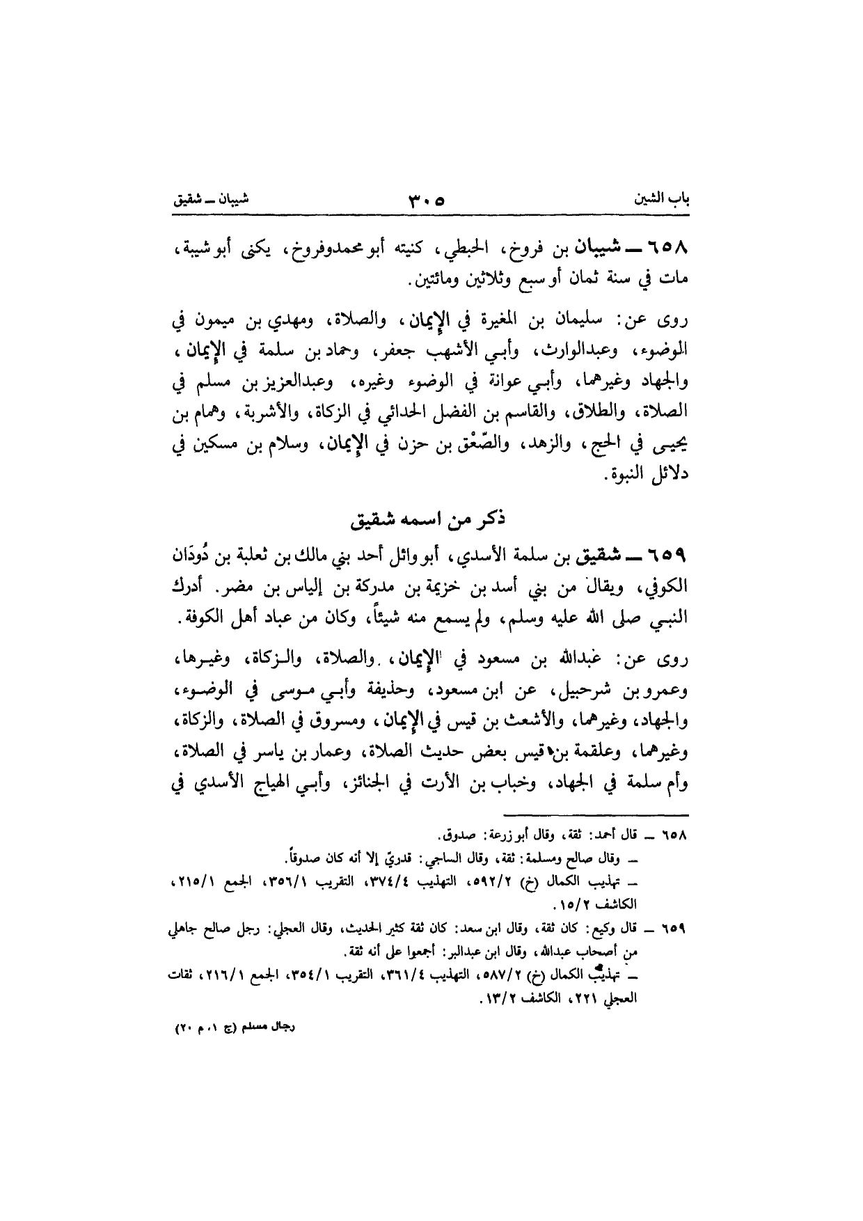 6599 - شَقِيق بن سَلمَة الْأَسدي أَبُو وَائِل أحد بني مَالك بن ثَعْلَبَة بن دودان الْكُوفِي وَيُقَال من بني أَسد بن خُزَيْمَة بن مدركة بن إلْيَاس بن مُضر أدْرك النَّبِي صلى الله عَلَيْهِ وَسلم وَلم يسمع مِنْهُ شَيْئا وَكَانَ من عباد أهل الْكُوفَة