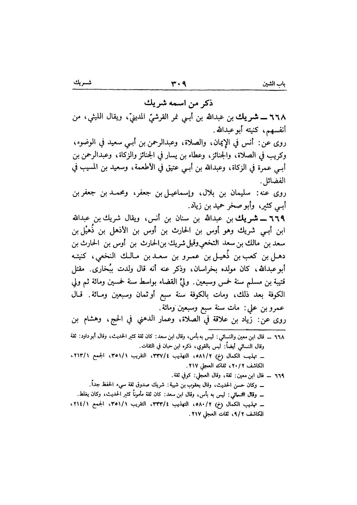 669 - شريك بن عبد الله بن سِنَان بن أنس وَيُقَال شريك بن عبد الله ابْن أبي شريك وَهُوَ أَوْس بن الْحَارِث بن أَوْس بن الأذهل بن ذهيل بن سعد بن مَالك بن سعد النَّخعِيّ وَقيل شريك بن الْحَارِث بن أَوْس بن الْحَارِث بن دهل بن كَعْب بن ذهيل بن عَمْرو بن سعد بن مَالك النَّخعِيّ كنيته أَبُو عبد الله كَانَ مولده بخراسان وَذكر عَنهُ أَنه قَالَ ولدت ببخارى مقتل قُتَيْبَة بن مُسلم سنة خمس وَسبعين ولي الْقَضَاء بواسط سنة خمسين وَمِائَة ثمَّ ولي الْكُوفَة بعد ذَلِك وَمَات بِالْكُوفَةِ سنة سبع أَو ثَمَان وَسبعين وَمِائَة قَالَ عَمْرو بن عَليّ مَاتَ سنة سبع وَسبعين وَمِائَة