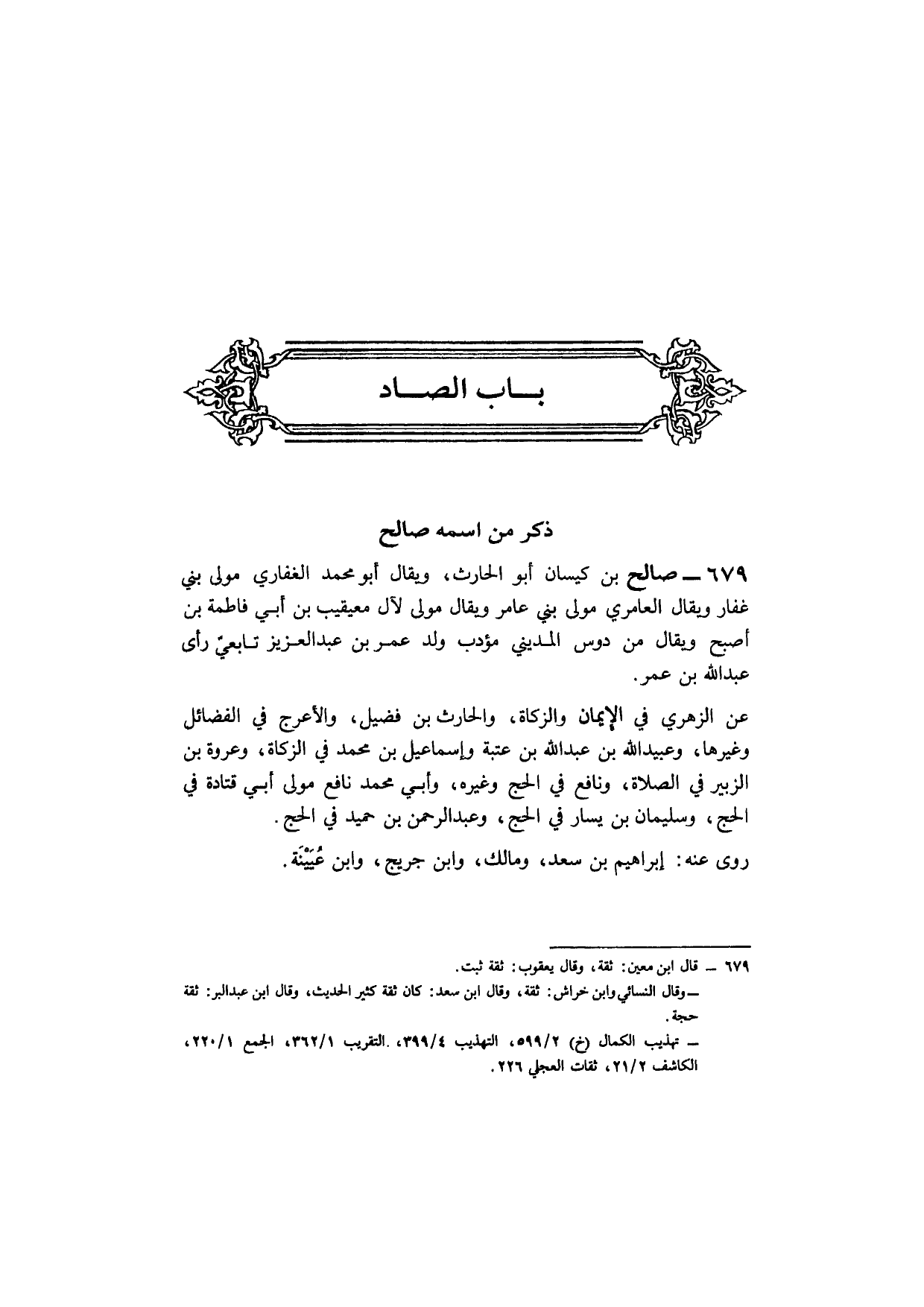 679 - صَالح بن كيسَان أَبُو الْحَارِث وَيُقَال أَبُو مُحَمَّد الْغِفَارِيّ مولى بني غفار وَيُقَال العامري مولى بني عَامر وَيُقَال مولى لآل معيقيب بن أبي فَاطِمَة بن أصبح وَيُقَال من دوس الْمَدِينِيّ مؤدب ولد عمر بن عبد العزيز تَابِعِيّ رأى عبد الله بن عمر