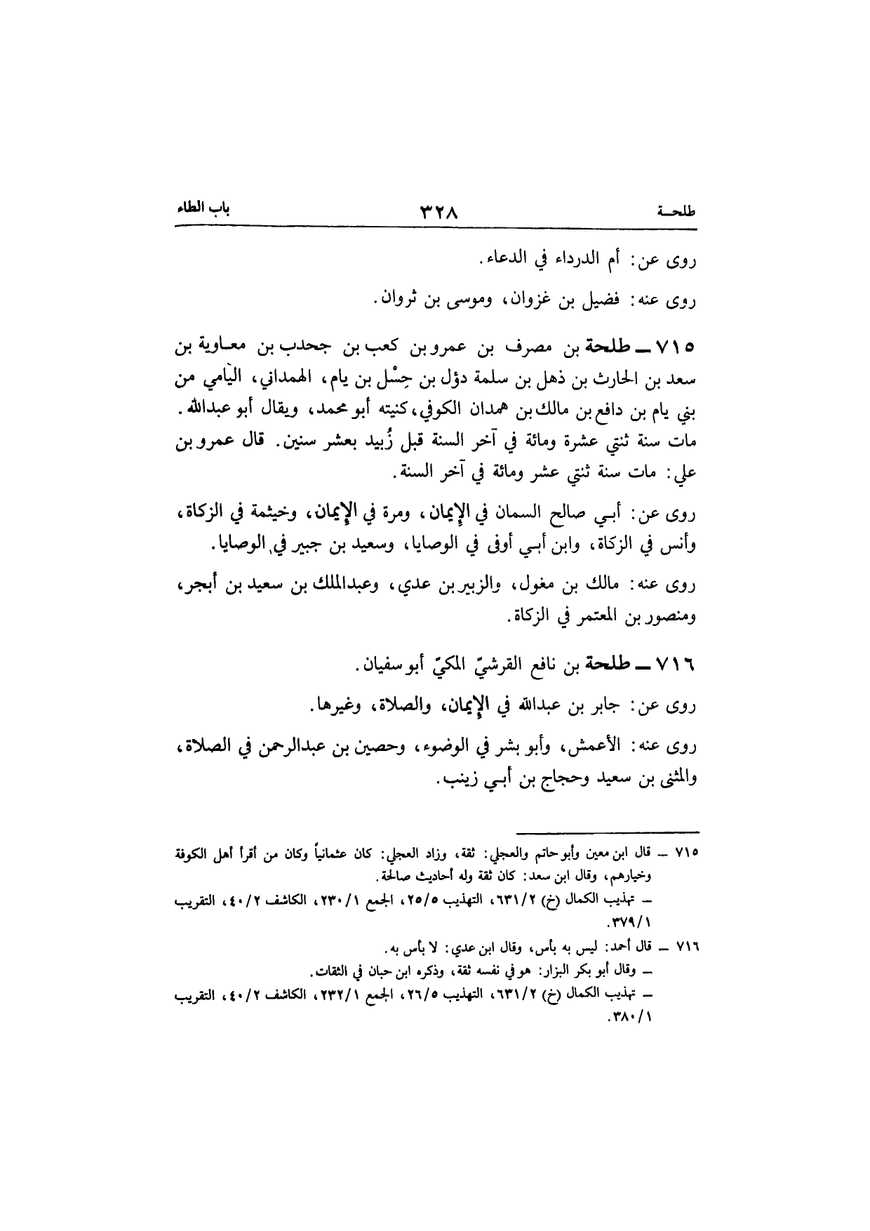 715 - طَلْحَة بن مصرف بن عَمْرو بن كَعْب بن جحدب بن مُعَاوِيَة بن سعد بن الْحَارِث بن ذهل بن سَلمَة دؤل بن حسل بن يام الهمداين اليامي من بني يام بن دَافع بن مَالك بن هَمدَان الْكُوفِي كنيته أَبُو مُحَمَّد وَيُقَال أَبُو عبد الله مَاتَ سنة ثِنْتَيْ عشرَة وَمِائَة فِي آخر السّنة قبل زبيد بِعشر سِنِين قَالَ عَمْرو بن عَليّ مَاتَ سنة ثِنْتَيْ عشر وَمِائَة فِي آخر السّنة