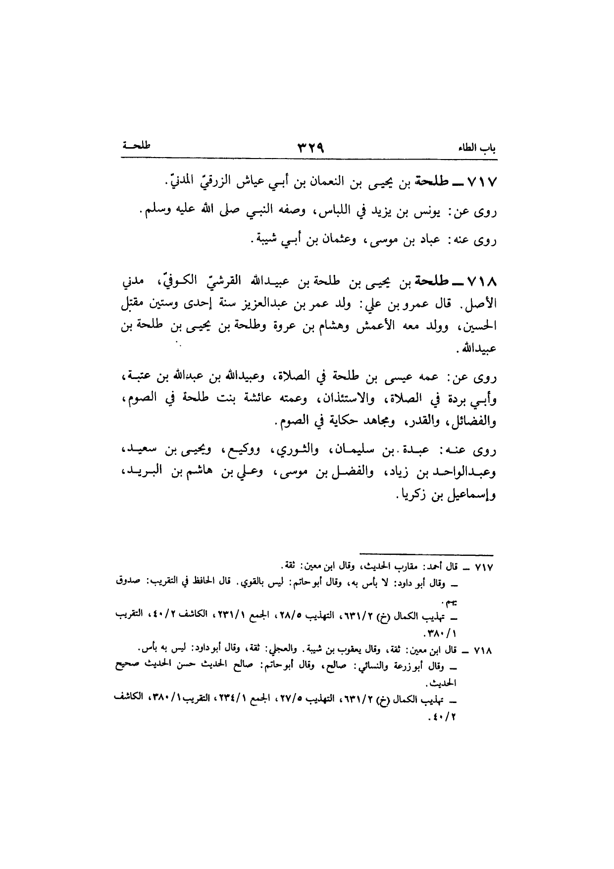 718 - طَلْحَة بن يحيى بن طَلْحَة بن عبيد الله الْقرشِي الْكُوفِي مدنِي الأَصْل قَالَ عَمْرو بن عَليّ ولد عمر بن عبد العزيز سنة إِحْدَى وَسِتِّينَ مقتل الْحُسَيْن وَولد مَعَه الْأَعْمَش وَهِشَام بن عُرْوَة وَطَلْحَة بن يحيى بن طَلْحَة بن عبيد الله
