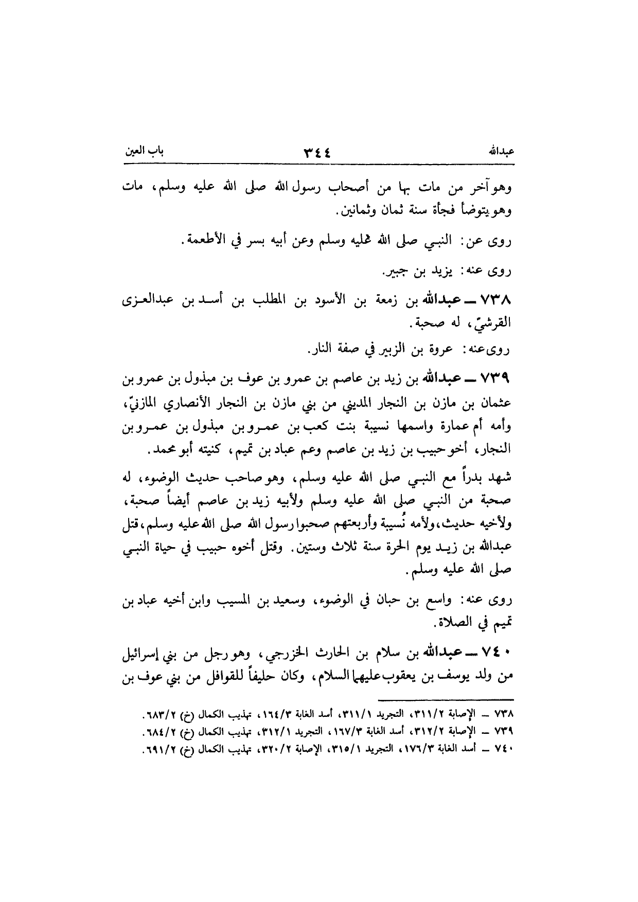 739 - عبد الله بن زيد بن عَاصِم بن عَمْرو بن عَوْف بن مبذول بن عَمْرو بن عُثْمَان بن مَازِن بن النجار الْمَدِينِيّ من بني مَازِن بن النجار الْأنْصَارِيّ الْمَازِني وَأمه أم عمَارَة وَاسْمهَا نسيبة بنت كَعْب بن عَمْرو بن مبذول بن عَمْرو بن النجار أَخُو حبيب بن زيد بن عَاصِم وَعم عباد بن تَمِيم كنيته أَبُو مُحَمَّد