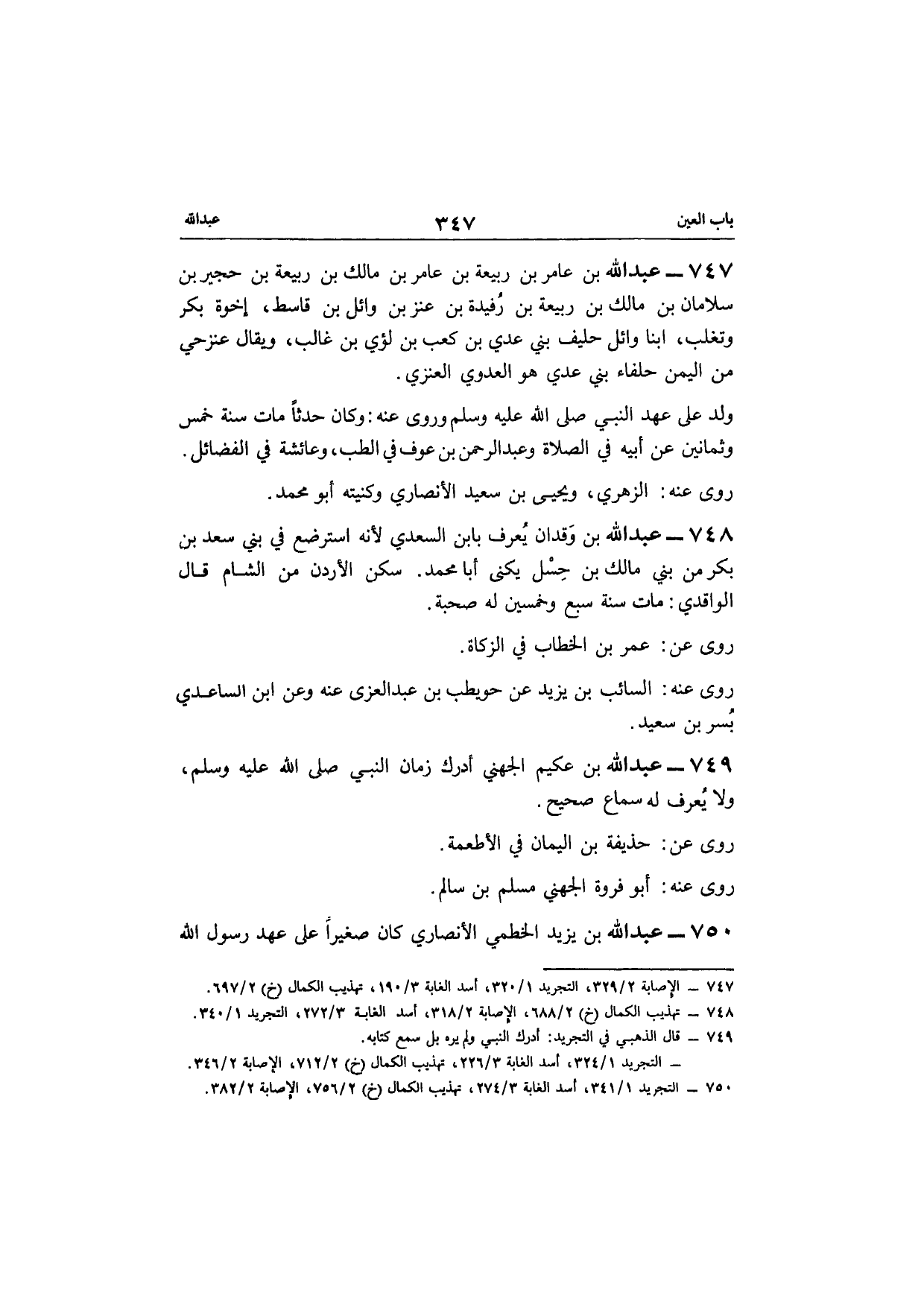 747 - عبد الله بن عَامر بن ربيعَة بن عَامر بن مَالك بن ربيعَة بن حُجَيْر بن سلامان بن مَالك بن ر بيعَة بن رفيدة بن عنز بن وَائِل بن قاسط إخْوَة بكر وتغلب ابْنا وَائِل حَلِيف بني عدي بن كَعْب بن لؤَي بن غَالب وَيُقَال عنزحي من الْيمن حلفاء بني عدي هُوَ الْعَدوي الْعَنزي