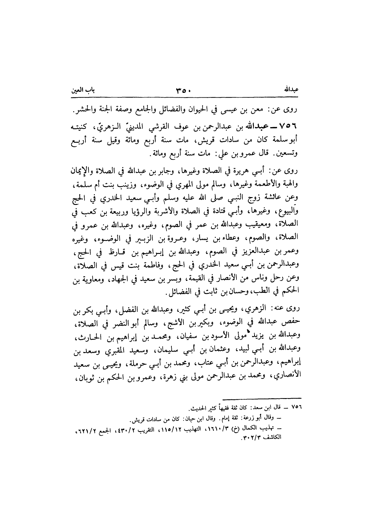 756 - عبد الله بن عبد الرحمن بن عَوْف الْقرشِي الْمَدِينِيّ الزُّهْرِيّ كنيته أَبُو سَلمَة كَانَ من سَادَات قُرَيْش مَاتَ سنة أَربع وَمِائَة وَقيل سنة أَربع وَتِسْعين قَالَ عَمْرو بن عَليّ مَاتَ سنة أَربع وَمِائَة