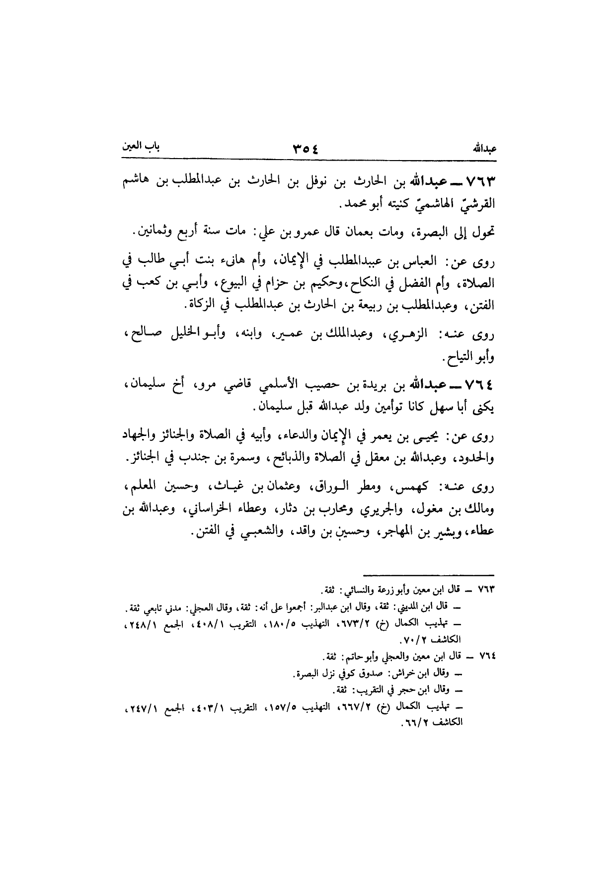 763 - عبد الله بن الْحَارِث بن نَوْفَل بن الْحَارِث بن عبد المطلب بن هَاشم الْقرشِي الْهَاشِمِي كنيته أَبُو مُحَمَّد