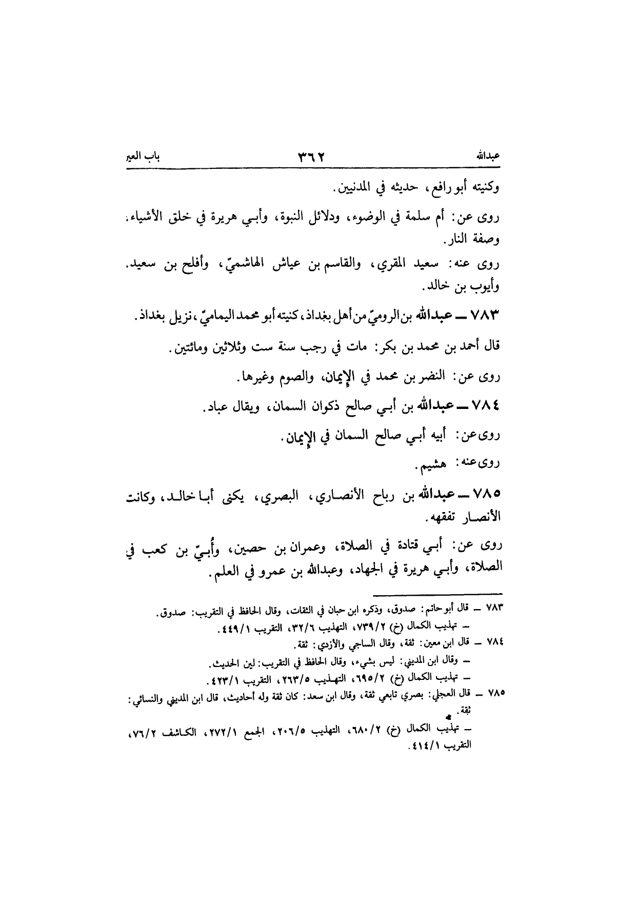 783 - عبد الله بن الرُّومِي من أهل بغداذ كنيته أَبُو مُحَمَّد اليمامي نزيل بغداذ قَالَ أَحْمد بن مُحَمَّد بن بكر مَاتَ فِي رَجَب سنة سِتّ وَثَلَاثِينَ وَمِائَتَيْنِ