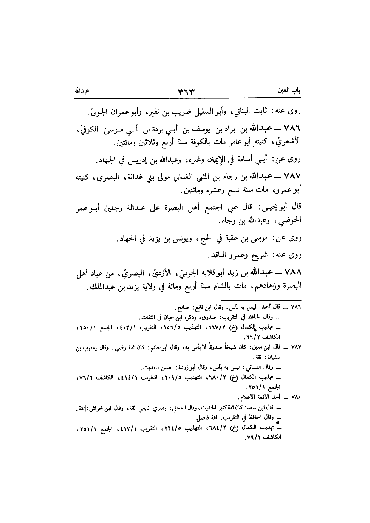 788 - عبد الله بن زيد أَبُو قلَابَة الْجرْمِي الْأَزْدِيّ الْبَصْرِيّ من عباد أهل الْبَصْرَة وزهادهم مَاتَ بِالشَّام سنة أَربع وَمِائَة فِي ولَايَة يزِيد بن عبد الملك