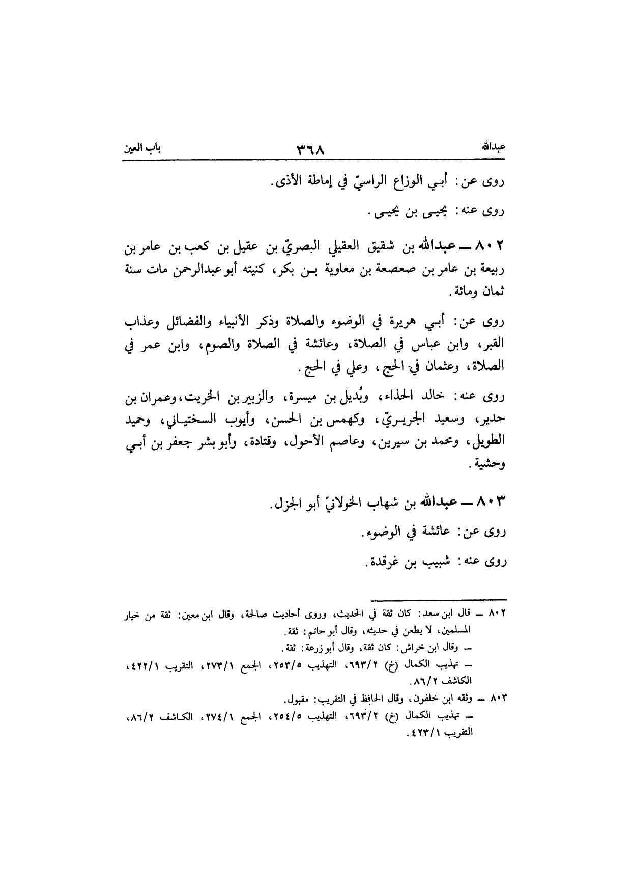 802 - عبد الله بن شَقِيق الْعقيلِيّ الْبَصْرِيّ بن عقيل بن كَعْب بن عَامر بن ربيعَة بن عَامر بن صعصعة بن مُعَاوِيَة بن بكر كنيته أَبُو عبد الرحمن مَاتَ سنة ثَمَان وَمِائَة