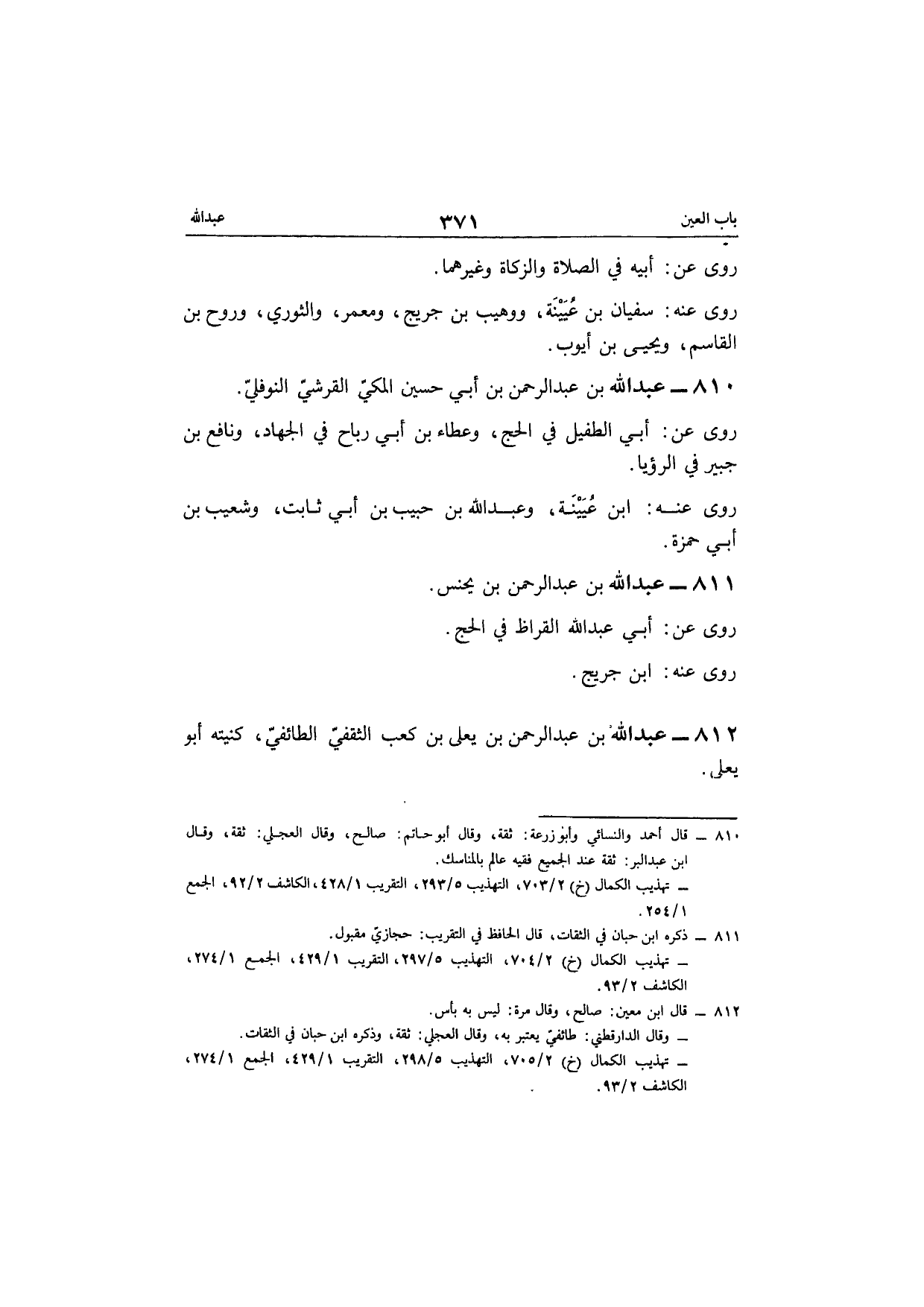 812 - عبد الله بن عبد الرحمن بن يعلى بن كَعْب الثَّقَفِيّ الطَّائِفِي كنيته أَبُو يعلى