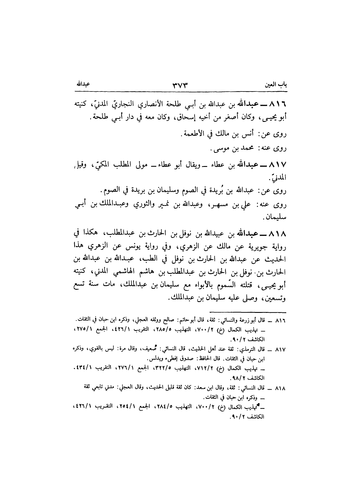 816 - عبد الله بن عبد الله بن أبي طَلْحَة الْأنْصَارِيّ النجاري الْمدنِي كنيته أَبُو يحيى وَكَانَ أَصْغَر من أَخِيه إِسْحَاق وَكَانَ مَعَه فِي دَار أبي طَلْحَة