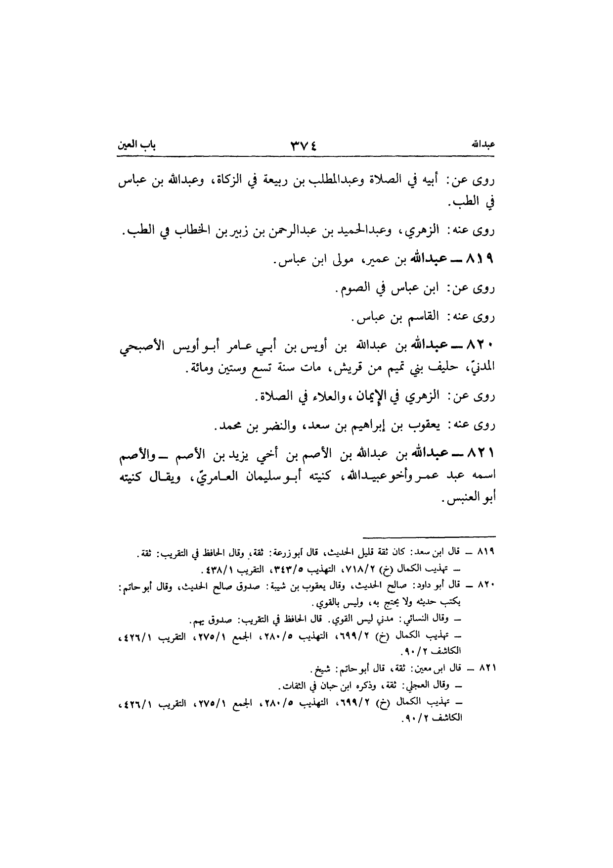 820 - عبد الله بن عبد الله بن أويس بن أبي عَامر أَبُو أويس الأصبحي الْمدنِي حَلِيف بني تَمِيم من قُرَيْش مَاتَ سنة تسع وَسِتِّينَ وَمِائَة