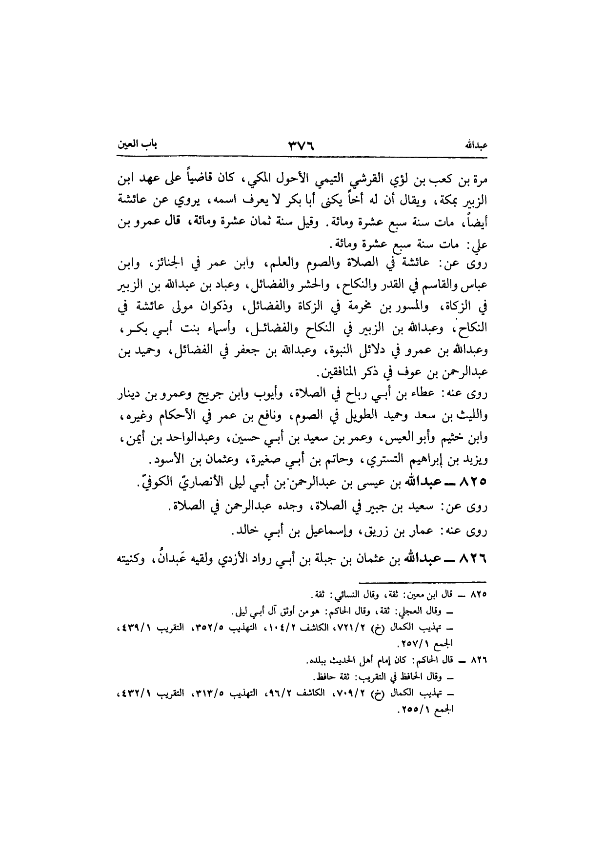 826 - عبد الله بن عُثْمَان بن جبلة بن أبي رواد الْأَزْدِيّ ولقيه عَبْدَانِ وكنيته