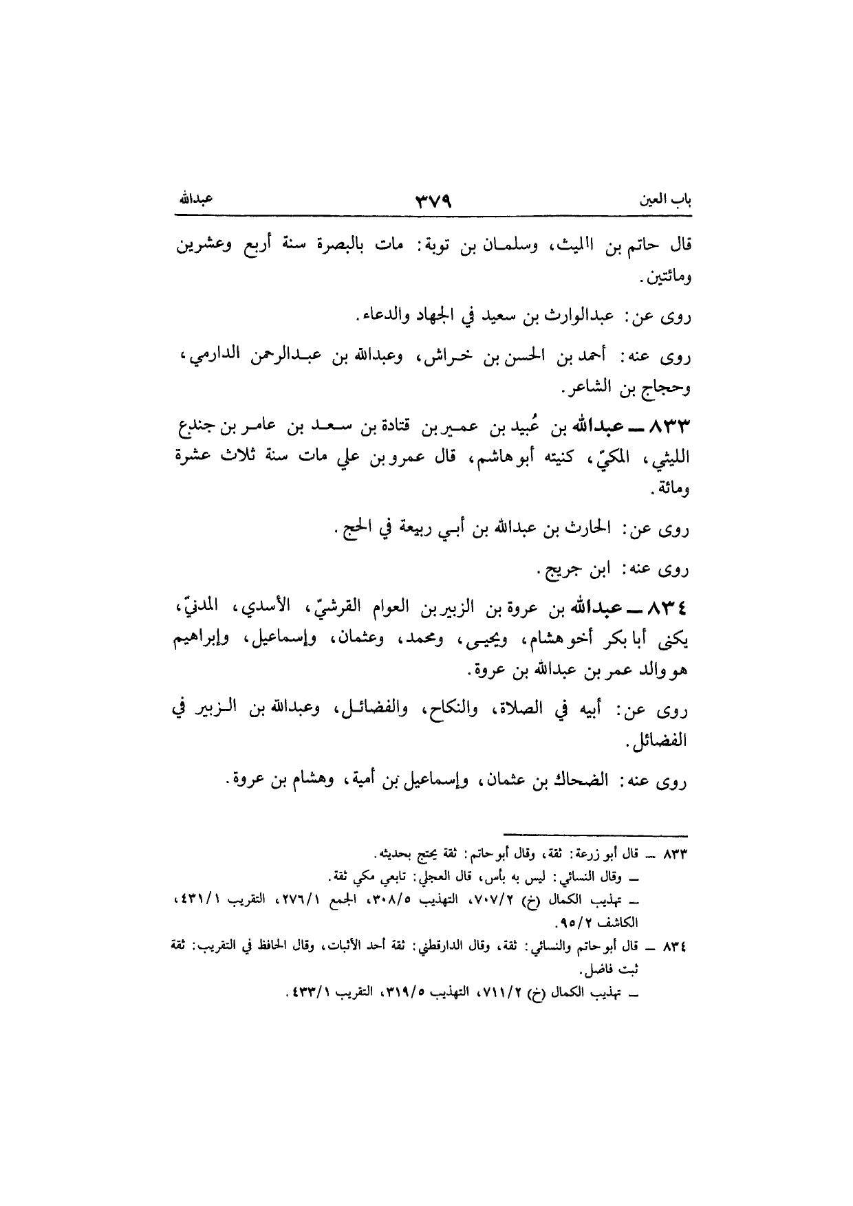 834 - عبد الله بن عُرْوَة بن الزبير بن الْعَوام الْقرشِي الْأَسدي الْمدنِي يكنى أَبَا بكر أَخُو هِشَام وَيحيى وَمُحَمّد وَعُثْمَان وَإِسْمَاعِيل وَإِبْرَاهِيم هُوَ وَالِد عمر بن عبد الله بن عُرْوَة