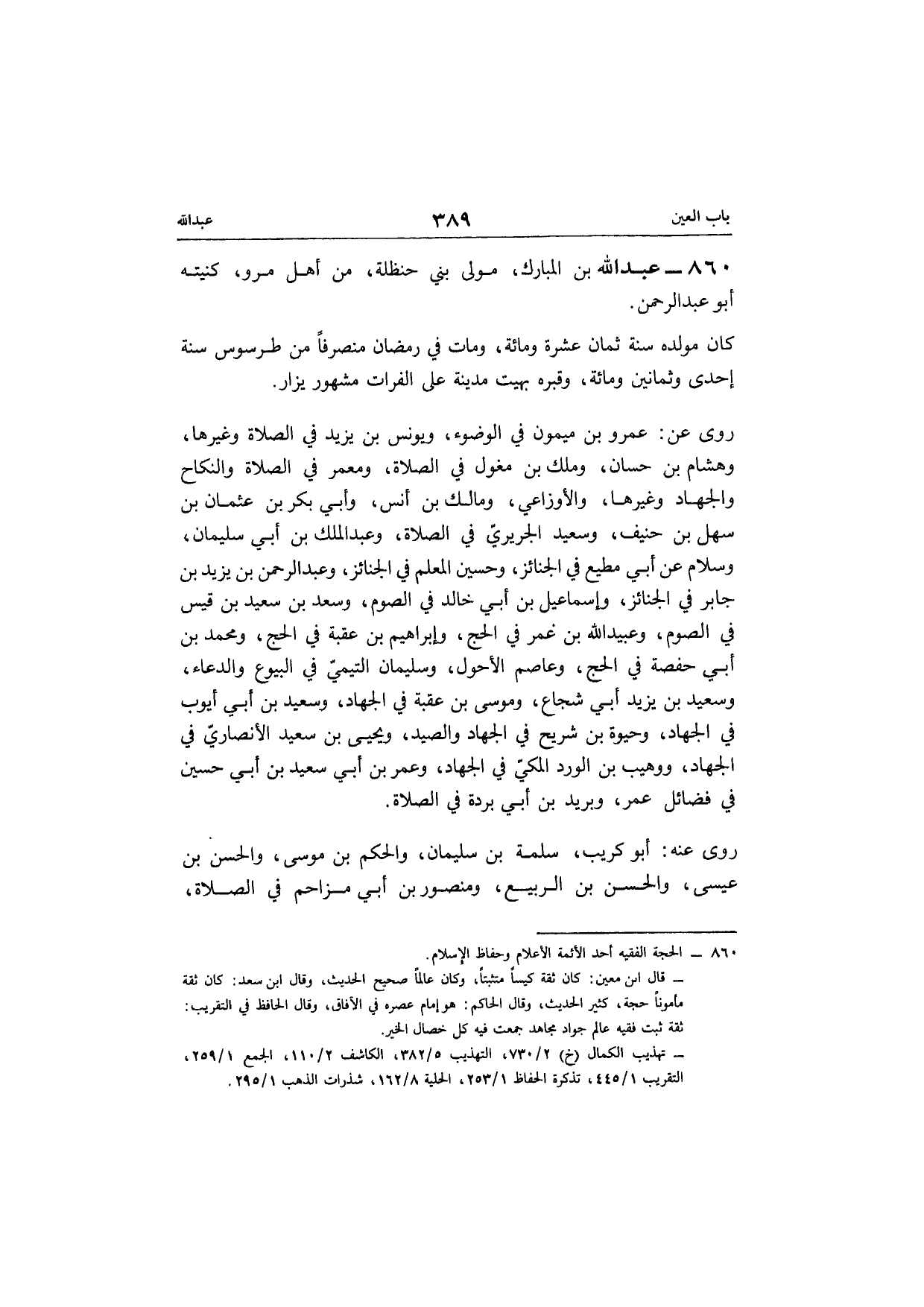 860 - عبد الله بن الْمُبَارك مولى بني حَنْظَلَة من أهل مرو كنيته أَبُو عبد الرحمن