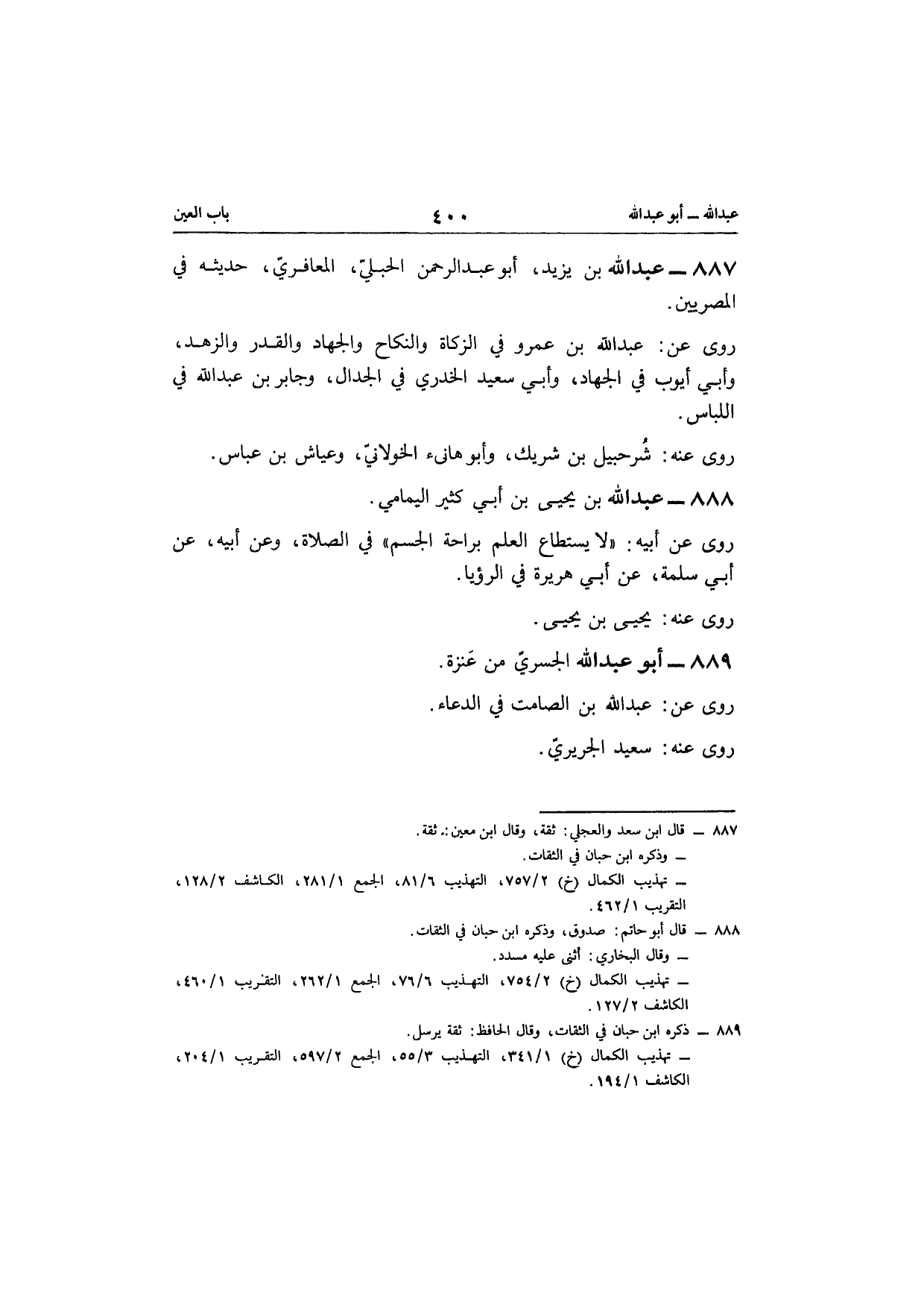 887 - عبد الله بن يزِيد أَبُو عبد الرحمن الحبلي الْمعَافِرِي حَدِيثه فِي المصريين