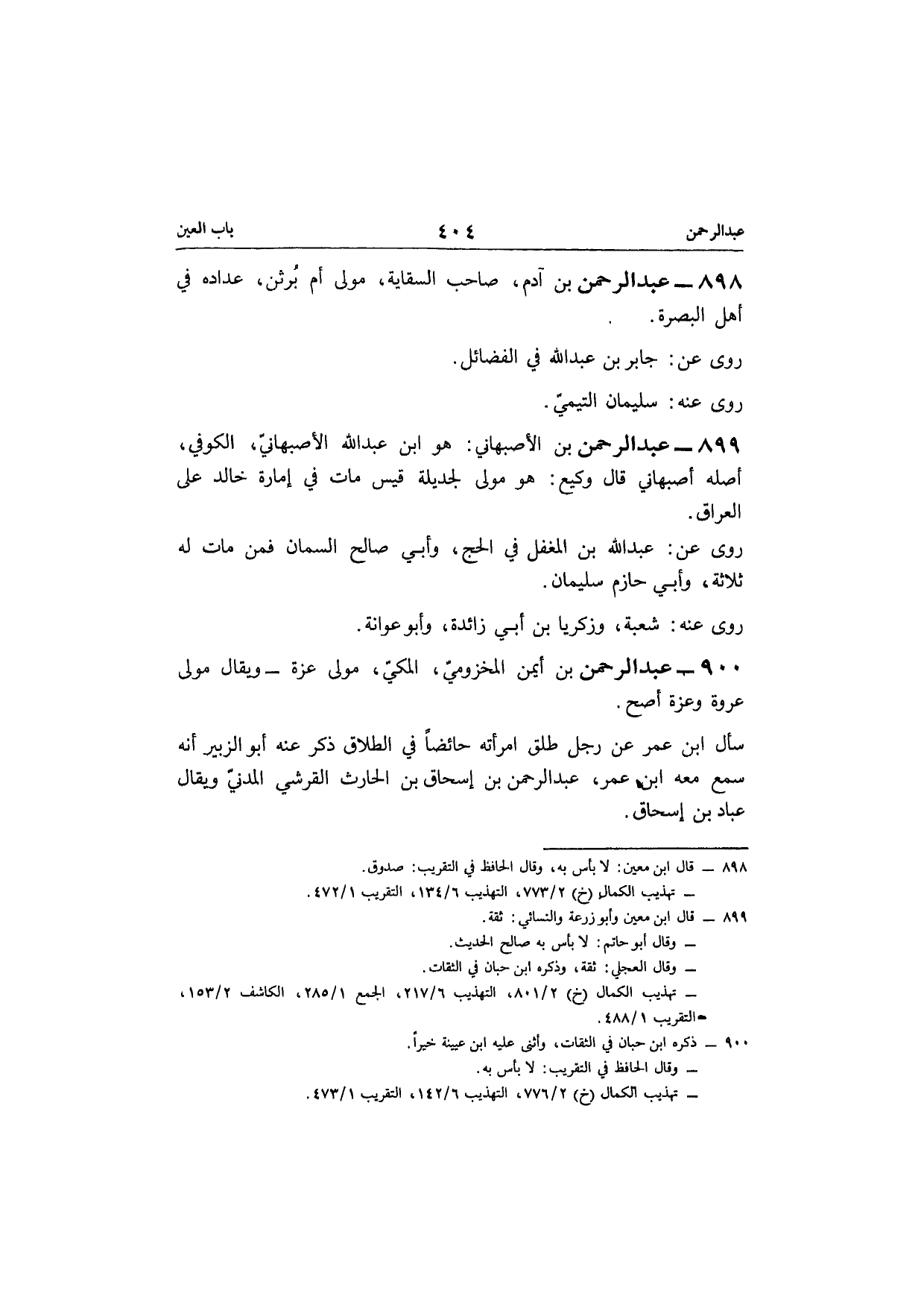 899 - عبد الرحمن بن الْأَصْبَهَانِيّ هُوَ ابْن عبد الله الْأَصْبَهَانِيّ الْكُوفِي أَصله أصبهاني قَالَ وَكِيع هُوَ مولى لجديلة قيس مَاتَ فِي إِمَارَة خَالِد على الْعرَاق