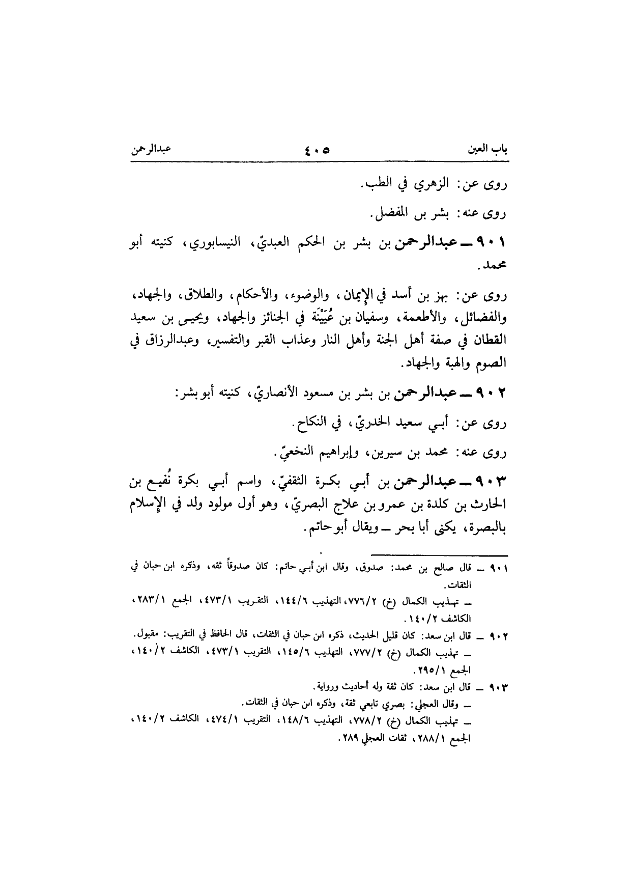 901 - عبد الرحمن بن بشر بن الحكم الْعَبْدي النَّيْسَابُورِي كنيته أَبُو مُحَمَّد