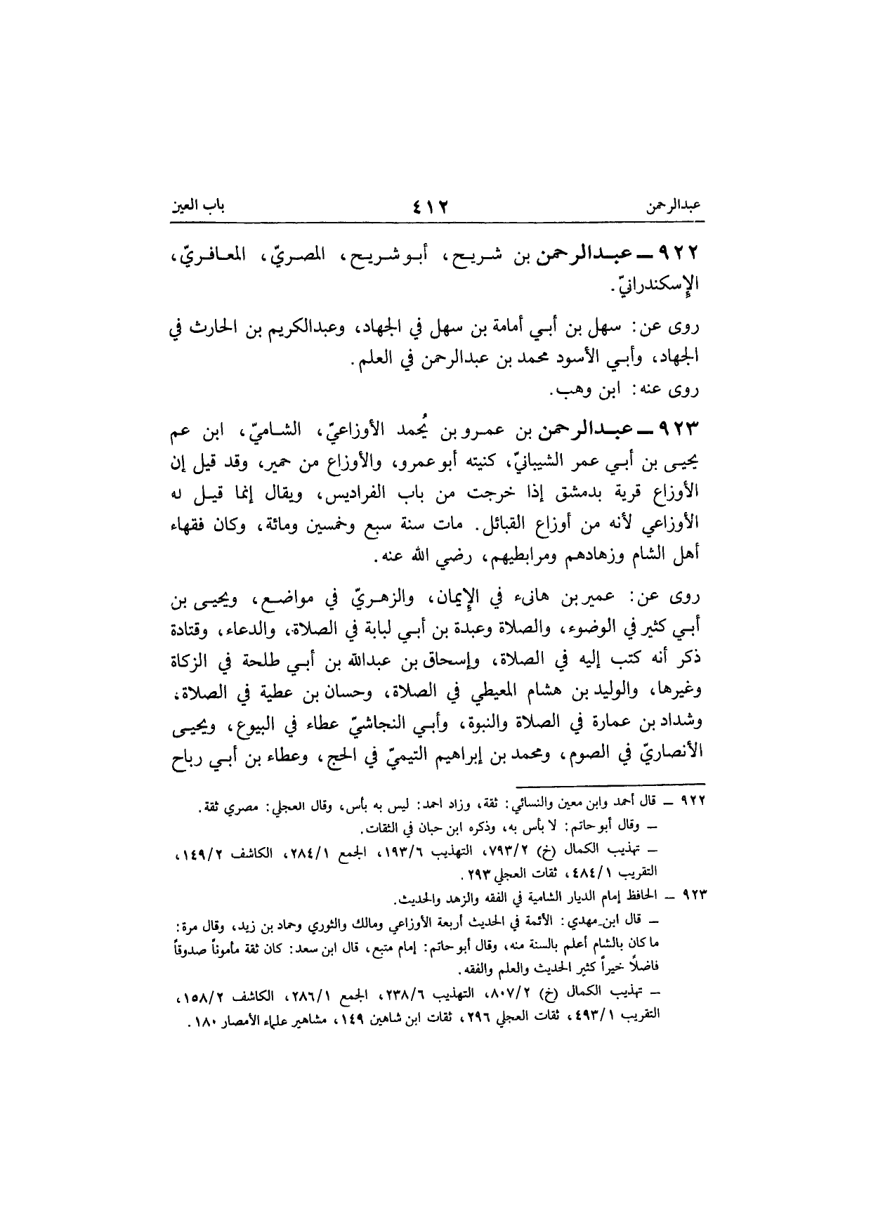 923 - عبد الرحمن بن عَمْرو بن يحمد الْأَوْزَاعِيّ الشَّامي ابْن عَم يحيى بن أبي عمر الشَّيْبَانِيّ كنيته أَبُو عَمْرو والأوزاع من حمير وَقد قيل إِن الأوزاع قَرْيَة بِدِمَشْق إِذا خرجت من بَاب الفراديس وَيُقَال إِنَّمَا قيل لَهُ الْأَوْزَاعِيّ لِأَنَّهُ من أوزاع الْقَبَائِل مَاتَ سنة سبع وَخمسين وَمِائَة وَكَانَ فُقَهَاء أهل الشَّام وزهادهم ومرابطيهم رَضِي الله عَنهُ
