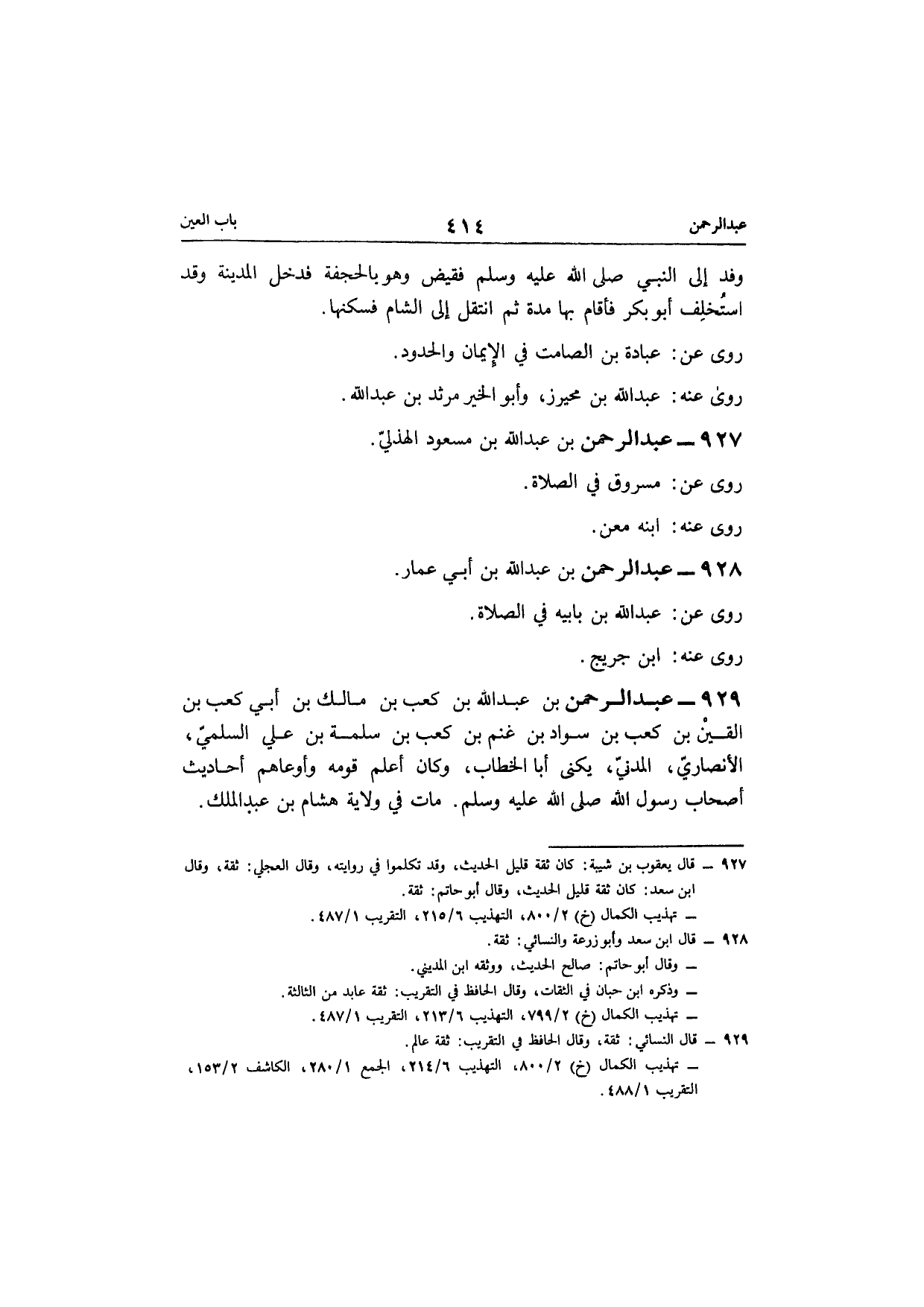 929 - عبد الرحمن بن عبد الله بن كَعْب بن مَالك بن أبي كَعْب بن الْقَيْن بن كَعْب بن سَواد بن غنم بن كَعْب بن سَلمَة بن عَليّ السّلمِيّ الْأنْصَارِيّ الْمدنِي يكنى أَبَا الْخطاب وَكَانَ أعلم قومه وأوعاهم أَحَادِيث أَصْحَاب رَسُول الله صلى الله عَلَيْهِ وَسلم مَاتَ فِي ولَايَة هِشَام بن عبد الملك