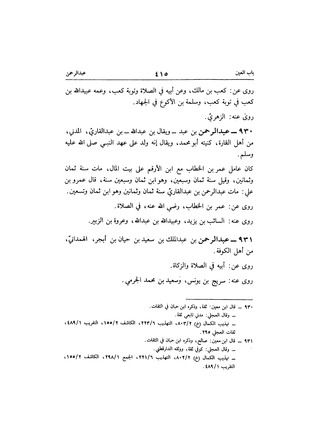 930 - عبد الرحمن بن عبد وَيُقَال بن عبد الله بن عبد القاري الْمدنِي من أهل القارة كنيته أَبُو مُحَمَّد وَيُقَال إِنَّه ولد على عهد النَّبِي صلى الله عَلَيْهِ وَسلم