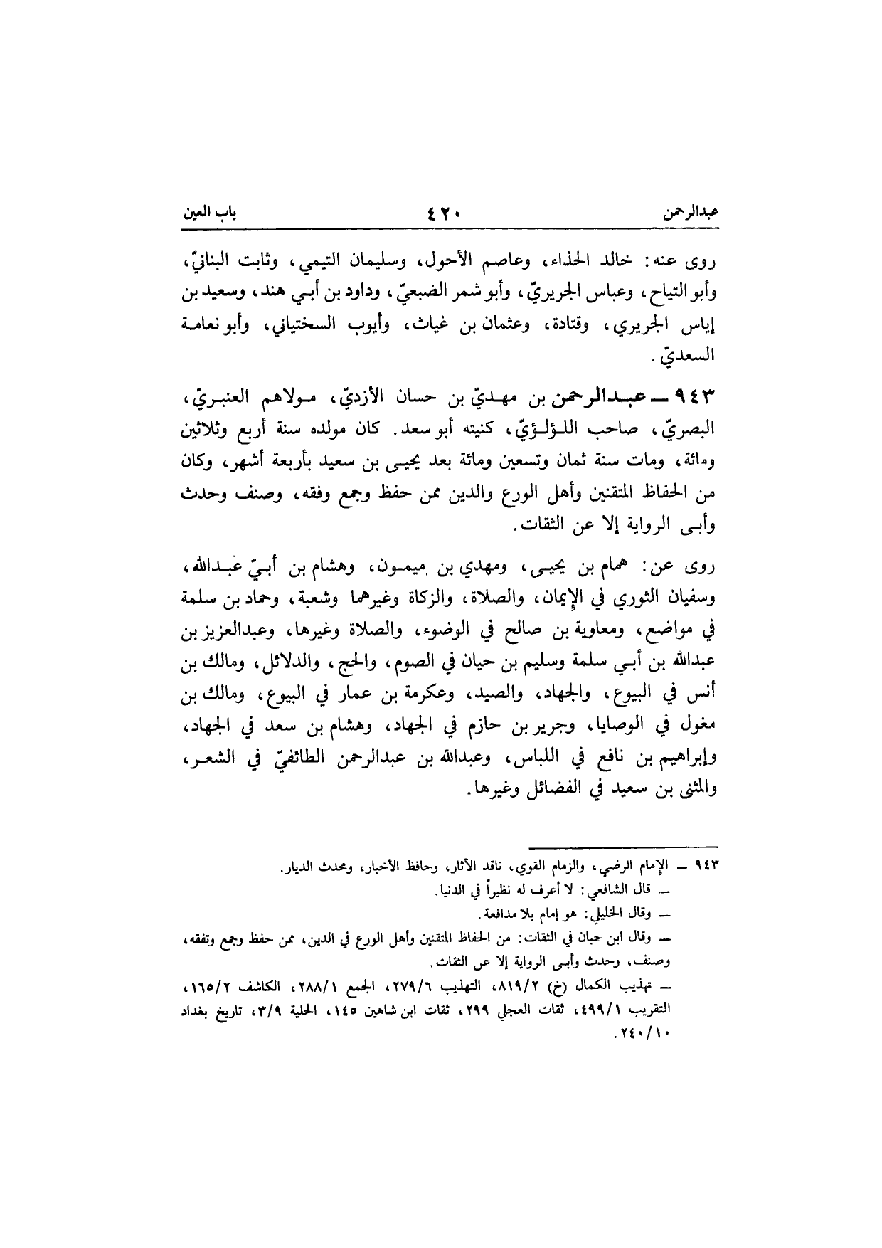 943 - عبد الرحمن بن مهْدي بن حسان الْأَزْدِيّ مَوْلَاهُم الْعَنْبَري الْبَصْرِيّ صِحَاب اللؤْلُؤِي كنيته أَبُو سعد كَانَ مولده سنة أَربع وَثَلَاثِينَ وَمِائَة وَمَات سنة ثَمَان وَتِسْعين وَمِائَة بعد يحيى بن سعيد بأَرْبعَة أشهر وَكَانَ من الْحفاظ المتقنين وَأهل الْوَرع وَالدّين مِمَّن حفظ وَجمع وَفقه وصنف وَحدث وَأبي الرِّوَايَة إِلَّا عَن الثِّقَات